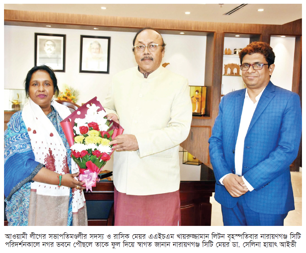 নারায়ণগঞ্জ সিটি করপোরেশনের মেয়র ডা. সেলিনা হায়াৎ আইভীর সঙ্গে সৌজন্য সাক্ষাৎ ও নারায়ণগঞ্জ সিটির বিভিন্ন উন্নয়নমূলক কাজ পরিদর্শন করেছেন বাংলাদেশ আওয়ামী লীগের সভাপতিমণ্ডলীর সদস্য ও রাজশাহী সিটি করপোরেশনের (রাসিক) মেয়র এ এইচ এম খায়রুজ্জামান লিটন। বৃহস্পতিবার নারায়ণগঞ্জ সিটি করপোরেশনের মেয়র ডা. সেলিনা হায়াৎ আইভীর আমন্ত্রণে নারায়ণগঞ্জ সিটি পরিদর্শনে যান রাসিক মেয়র। নগর ভবনে পৌঁছলে রাসিক মেয়রকে ফুল দিয়ে স্বাগত জানান নারায়ণগঞ্জ সিটি মেয়র। এরপর দুই সিটির উন্নয়নমূলক কাজসহ বিভিন্ন বিষয়ে মতবিনিময় করেন তারা। পরে রাজশাহী সিটি মেয়র এ এইচ এম খায়রুজ্জামান লিটনকে নগর ভবন, শেখ রাসেল নগর পার্ক, বাবুরাইল খাল ও চারুকলা ইনস্টিটিউট ঘুরে দেখান নারায়ণগঞ্জ মেয়র আইভী।