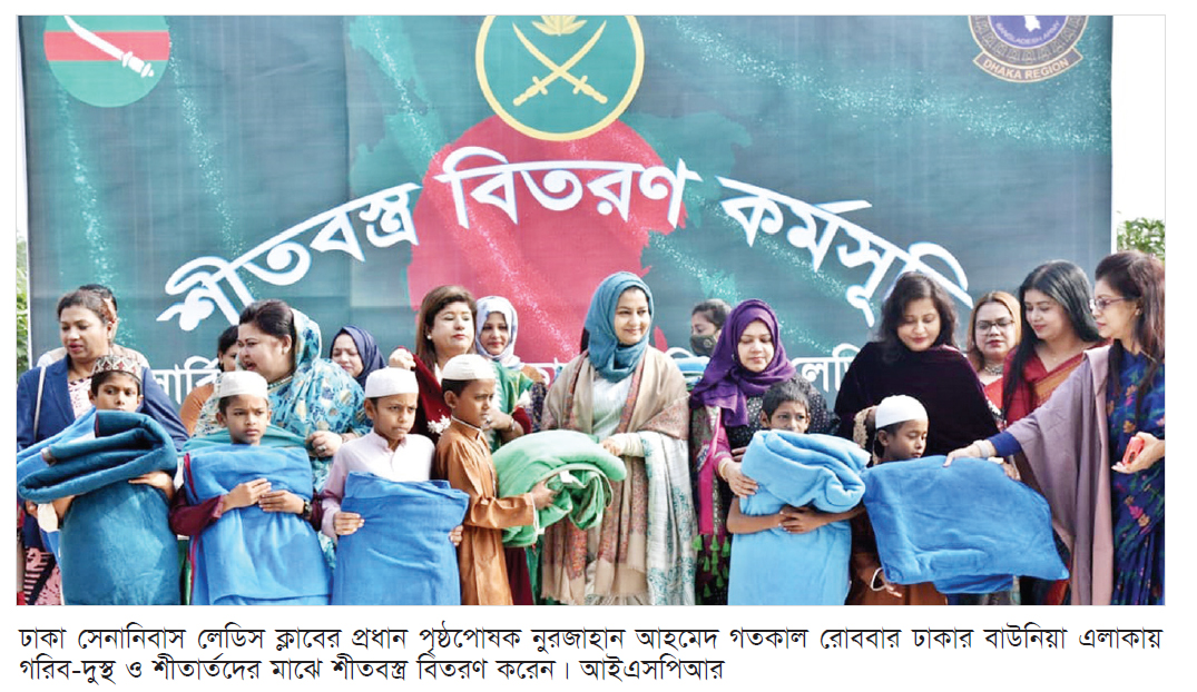 ঢাকা সেনানিবাস লেডিস ক্লাবের প্রধান পৃষ্ঠপোষক নুরজাহান আহমেদ গতকাল রোববার প্রধান অতিথি হিসেবে ঢাকার বাউনিয়া এলাকায় অসহায়, দুস্থ ও গরিব-দুঃখী ১০০০টি পরিবারের মাঝে শীতবস্ত্র বিতরণ করেন। প্রধান অতিথির এই জনসেবামূলক কর্মকাণ্ড অব্যাহত থাকবে বলে আশাবাদ ব্যক্ত করেন। এছাড়াও এ ধরনের মানবিক কার্যক্রমে অব্যাহত সহযোগিতা প্রদানের জন্য ঢাকা সেনানিবাস লেডিস ক্লাবের সব সদস্যকে তিনি আন্তরিক ধন্যবাদ জানান।