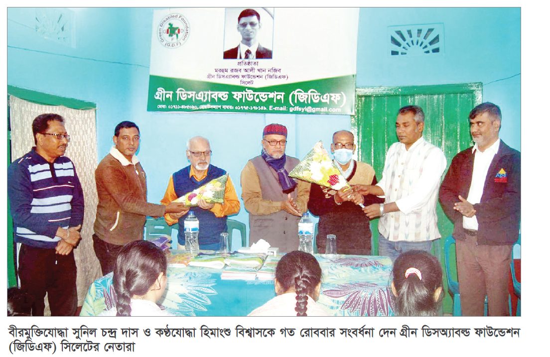 সিলেটে বীরমুক্তিযোদ্ধা সুনিল চন্দ্র দাস ও কণ্ঠযোদ্ধা হিমাংশু বিশ্বাসকে সংবর্ধনা দিয়েছে গ্রীন ডিসঅ্যাবল্ড ফাউন্ডেশন (জিডিএফ)। গত রোববার সিলেট নগরীর জিন্দাবাজারের জিডিএফ কার্যালয়ে সংবর্ধনা প্রদান ও জিডিএফ-ডিকেফ দৃষ্টি প্রতিবন্ধী বিদ্যালয়ের প্রতিবন্ধী শিক্ষার্থীদের মধ্যে ব্রেইল বই বিতরণ কার্যক্রম অনুষ্ঠিত হয়।