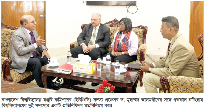 প্রফেসর মুহাম্মদ আলমগীরের কক্ষে গতকাল সকালে এ সভা অনুষ্ঠিত হয়। কলেজ এডুকেশন ডেভেলপমেন্ট প্রজেক্টের (সিইডিপি) আওতায় নটিংহাম বিশ্ববিদ্যালয় দেশের কলেজসমূহে উচ্চশিক্ষায় নিয়োজিত শিক্ষকদের শিখন ও দক্ষতার উন্নয়নে বিষয়ভিত্তিক প্রশিক্ষণ প্রদান করছে। সভায় প্রতিনিধিদল শিক্ষক প্রশিক্ষণের অগ্রগতির নানা দিক তুলে ধরেন।