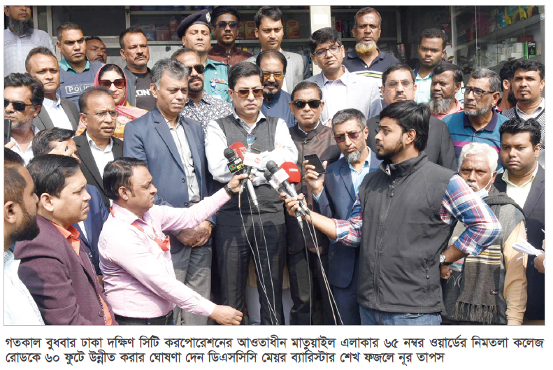 ঢাকা দক্ষিণ সিটি করপোরেশনের (ডিএসসিসি) আওতাধীন মাতুয়াইল এলাকার ৬৫ নম্বর ওয়ার্ডের নিমতলা কলেজ রোডকে ৬০ ফুটে উন্নীত করার ঘোষণা দিয়েছেন ডিএসসিসি মেয়র ব্যারিস্টার শেখ ফজলে নূর তাপস। গতকাল বুধবার সকালে মেয়র তাপস ডেমরা থানাধীন মাতুয়াইল এলাকার ৬৫ নম্বর ওয়ার্ডের সড়কের উন্নয়নমূলক কার্যক্রম পরিদর্শন শেষে গণমাধ্যমের সঙ্গে আলাপকালে এ ঘোষণা দেন। মেয়র বলেন, আমাদের নজরে এসেছে যে, এই এলাকাটি অত্যন্ত জনবহুল এবং এই সড়কটি অত্যন্ত গুরুত্বপূর্ণ ও বহুল ব্যবহৃত। আশপাশে অনেক কলকারখানা, দোকানপাট রয়েছে। এই এলাকাটি একটি ব্যবসায়িক প্রাণকেন্দ্র। আমরা বিশদ অঞ্চল পরিকল্পনাসহ আরএসটিপি পর্যালোচনা করে এই সড়কটিকে প্রশস্ত করব। সড়কটা সংস্কার করব। নর্দমা ও হাঁটার পথসহ আমরা এই সড়কটিকে চার সারিতে উন্নীত করব। সড়কের উভয় পাশে ১০ ফিট করে হাঁটার পথসহ ৬০ ফিটের একটি রাস্তা নির্মাণের জন্য আমরা উদ্যোগ গ্রহণ করব। সেই পরিপ্রেক্ষিতে সরেজমিন পরিদর্শনে আজকে আমরা এখানে এসেছি। প্রকাশিত প্রতিবেদন থেকে সড়কটির বেহাল দশা সম্পর্কে অবগত হয়েছেন জানিয়ে মেয়র বলেন, একটি বেসরকারি টেলিভিশনের প্রতিবেদন দেখে আমরা আজকে এখানে এসেছি। আমি এখানে পরিদর্শনে এসে এই এলাকার জনগণের সঙ্গে কথা বলেছি। এর আগে এটা নজরে আসেনি। সংশ্লিষ্ট প্রতিবেদনের ফলে সড়কটির বেহাল দশা সম্পর্কে আমাদের নজরে এসেছে। সেজন্য আমি বেসরকারি টেলিভিশনটিকে ধন্যবাদ জানাই। শিগগিরই সড়কটির সংস্কার ও প্রশস্তকরণ কাজ শুরুর আশাবাদ জানিয়ে মেয়র এ সময় আরো বলেন, আমরা এই অর্থবছরের বাজেট থেকে অর্থ প্রাক্কলন এবং দরপত্র সম্পন্ন করতে চাই। আশা করছি, বর্ষার পরপরই এই রাস্তার কাজ শুরু করতে পারব। এ সময় অন্যদের মধ্যে ঢাকা-৫ আসনের সংসদ সদস্য কাজী মনিরুল ইসলাম মনু, করপোরেশনের প্রধান নির্বাহী কর্মকর্তা মো. মিজানুর রহমান, সচিব আকরামুজ্জামান, প্রধান প্রকৌশলী সালেহ আহম্মেদ, পরিবহন মহাব্যবস্থাপক মো. হায়দর আলী, অঞ্চল-৫ এর আঞ্চলিক নির্বাহী কর্মকর্তা মোহাম্মদ সাখাওয়াত হোসেন সরকার, তত্ত্বাবধায়ক প্রকৌশলী কাজী মো. বোরহান উদ্দিন, কাউন্সিলরদের মধ্যে ৬৫ নম্বর ওয়ার্ডের মো. সামসুদ্দিন ভূঁইয়া, ৬৩ নম্বর ওয়ার্ডের মো. শফিকুল ইসলাম খান এবং সংরক্ষিত আসনের নিলুফা ইয়াসমিনসহ করপোরেশনের ঊর্ধ্বতন কর্মকর্তারা উপস্থিত ছিলেন।
