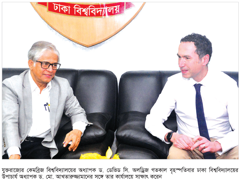 যুক্তরাজ্যের কেমব্রিজ বিশ্ববিদ্যালয়ের অধ্যাপক ড. ডেভিড সি. অলড্রিজ গতকাল বৃহস্পতিবার ঢাকা বিশ্ববিদ্যালয়ের উপাচার্য অধ্যাপক ড. মো. আখতারুজ্জামানের সঙ্গে তার কার্যালয়ে সাক্ষাৎ করেন। ঢাকা বিশ্ববিদ্যালয়ের জনসংযোগ দপ্তরের এক সংবাদ বিজ্ঞপ্তিতে এ তথ্য জানানো হয়।
