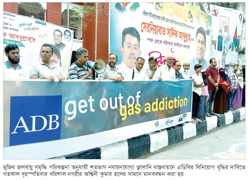 মুজিব জলবায়ু সমৃদ্ধি পরিকল্পনা অনুযায়ী শতভাগ নবায়নযোগ্য জ্বালানি বাস্তবায়নে এডিবি’র (এশীয় উন্নয়ন ব্যাংক) বিনিয়োগ বৃদ্ধির দাবিতে বরিশালে মানববন্ধন করা হয়েছে। নগরীর অশ্বিনী কুমার হলের সামনে গতকাল বৃহস্পতিবার সকালে এই কর্মসূচির আয়োজন করা হয়। প্রান্তজন, উপকূলীয় জীবনযাত্রা ও পরিবেশ কর্মজোট (ক্লিন), এনজি ফোরাম অন এডিবি’র যৌথ উদ্যোগে এ মানববন্ধন করা হয়। এ সময় জলবায়ু কর্মীরা এডিবিকে জীবাশ্ম জ্বালানিতে বিনিয়োগ বন্ধের আহ্বান জানান।