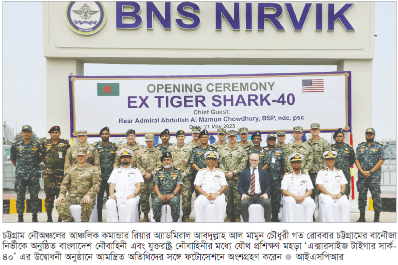 বাংলাদেশ নৌবাহিনী এবং যুক্তরাষ্ট্র নৌবাহিনীর মধ্যে যৌথ প্রশিক্ষণ মহড়া ‘এক্সারসাইজ টাইগার সার্ক-৪০’ এর উদ্বোধনী অনুষ্ঠান গত রোববার চট্টগ্রামের বানৌজা নির্ভীকে অনুষ্ঠিত হয়েছে। উক্ত মহড়ার উদ্বোধনী দিনে চট্টগ্রাম নৌঅঞ্চলের আঞ্চলিক কমান্ডার রিয়ার অ্যাডমিরাল আবদুল্লাহ আল মামুন চৌধুরী প্রধান অতিথি হিসেবে উপস্থিত ছিলেন। এছাড়া বাংলাদেশস্থ মার্কিন যুক্তরাষ্ট্র দূতাবাস থেকে নির্বাচিত প্রতিনিধিরা মহড়ায় যোগদান করেন। মহড়ায় অন্যদের মধ্যে সশস্ত্র বাহিনী বিভাগ, সেনাবাহিনী, নৌবাহিনী এবং চট্টগ্রাম নৌঅঞ্চলের অন্য কর্মকর্তা ও আমন্ত্রিত অতিথিরা উপস্থিত ছিলেন। কমডোর সোয়াড্স কমান্ডের ব্যবস্থাপনায় অনুষ্ঠিত এ প্রশিক্ষণ মহড়ায় বাংলাদেশ সেনা ও নৌবাহিনীর স্পেশাল ফোর্স এবং যুক্তরাষ্ট্রের স্পেশাল ফোর্স অংশগ্রহণ করে। যৌথ এ প্রশিক্ষণ মহড়ার মূল লক্ষ্য দুই দেশের সশস্ত্র বাহিনীর মধ্যে বিদ্যমান সু-সম্পর্ক উন্নয়নের পাশাপাশি উভয় দেশের কৌশলগত সক্ষমতা বৃদ্ধি এবং পারস্পারিক প্রযুক্তিগত ও পদ্ধতিগত জ্ঞান অর্জন করা। যৌথ মহড়াটি আগামী ১৫ জুন সমাপ্ত হবে। আন্তঃবাহিনী জনসংযোগ পরিদপ্তরের এক সংবাদ বিজ্ঞপ্তিতে এ তথ্য জানানো হয়।
