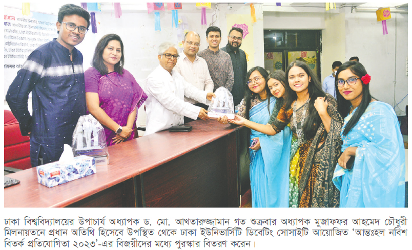 ঢাকা ইউনিভার্সিটি ডিবেটিং সোসাইটি (ডিইউডিএস) আয়োজিত ‘আন্তঃহল নবিশ বিতর্ক প্রতিযোগিতা ২০২৩’-এর বাংলা বিতর্কে চ্যাম্পিয়ন হয়েছে জাতির জনক বঙ্গবন্ধু শেখ মুজিবুর রহমান হল বিতর্ক ক্লাব এবং ইংরেজি বিতর্কে চ্যাম্পিয়ন হয়েছে বঙ্গমাতা শেখ ফজিলাতুন্নেছা মুজিব হল বিতর্ক ক্লাব। বাংলা বিতর্কে রানার্স-আপ হয় বিজয় একাত্তর হল বিতর্ক ক্লাব এবং ইংরেজি বিতর্কে রানার্স-আপ হয় শহীদ সার্জেন্ট জহুরুল হক হল বিতর্ক ক্লাব। ঢাকা বিশ্ববিদ্যালয়ের উপাচার্য অধ্যাপক ড. মো. আখতারুজ্জামান গত শুক্রবার অধ্যাপক মুজাফফর আহমেদ চৌধুরী মিলনায়তনে আয়োজিত এই প্রতিযোগিতার পুরস্কার বিতরণী অনুষ্ঠানে প্রধান অতিথি হিসেবে উপস্থিত থেকে বিজয়ীদের মধ্যে পুরস্কার বিতরণ করেন।