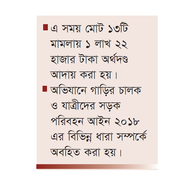 অভিযানে ভ্রাম্যমাণ আদালতের মাধ্যমে বিভিন্ন পরিবহনের কাছ থেকে ১ লাখ ২২ হাজার টাকা জরিমানা আদায় করা হয়েছে। গতকাল সকাল থেকে দুপুর পর্যন্ত ঢাকা-আরিচা মহাসড়কের হেমায়েতপুর এলাকায় ভ্রাম্যমাণ আদালত পরিচালনা করেন এক্সিকিউটিভ ম্যাজিস্ট্রেট ও সহকারী কমিশনার (ভূমি) মাসুমা আক্তার। তিনি বলেন, সড়ক পরিবহন আইন ২০১৮ এর ৬৬, ৭৫ এবং ৯২ ধারায় ভ্রাম্যমাণ আদালত পরিচালনা করা হয়। এ সময় গাড়ির ফিটনেস না থাকা, লাইসেন্স না থাকা, রোড পারমিট না থাকা, মোটরসাইকেলে চালকসহ দুইয়ের অধিক যাত্রী পরিবহন এবং হেলমেট না থাকা, উল্টো পথে গাড়ি চালানো- ইত্যাদি অপরাধ আমলে নিয়ে ভ্রাম্যমাণ আদালত আইন ২০০৯ অনুযায়ী বিভিন্ন পরিমাণ অর্থদণ্ড দেওয়া হয়।