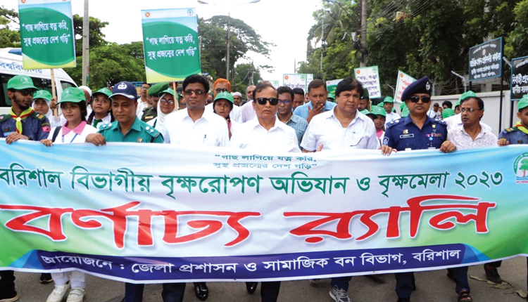 গাছ লাগিয়ে যত্ন করি, সুস্থ প্রজন্মের দেশ গড়ি এই স্লোগান নিয়ে গতকাল বুধবার সকাল ১০টায় জেলা প্রশাসন ও সামাজিক বন বিভাগ বরিশাল এর আয়োজনে নগরীর বঙ্গবন্ধু উদ্যানে বরিশাল বিভাগীয় বৃক্ষমেলা-২০২৩ উপলক্ষ্যে র্যালি, উদ্বোধনী অনুষ্ঠান, আলোচনা সভা অনুষ্ঠিত হয়। শুরুতে বেলুন ফেস্টুন উড়িয়ে ও ফিতা কেটে ১৫ দিনব্যাপী বৃক্ষমেলার উদ্বোধন করেন প্রধান অতিথি পানি সম্পদ মন্ত্রণালয়ের প্রতিমন্ত্রী ও বাংলাদেশ আওয়ামী লীগ বরিশাল জেলা শাখার সহ-সভাপতি কর্নেল (অব.) জাহিদ ফারুক শামীম (এমপি)। উদ্বোধন শেষে প্রধান অতিথিসহ অন্যান্য অতিথিরা বৃক্ষমেলা পরিদর্শন করেন পরে সেখান থেকে বর্ণাঢ্য এক র্যালি বের হয়ে নগরীর বিভিন্ন সড়ক প্রদক্ষিণ করে বঙ্গবন্ধু উদ্যানে সংলগ্ন শিল্পকলা একাডেমি গিয়ে শেষ হয়। সেখানে বিভাগীয় বৃক্ষমেলার আলোচনা সভা অনুষ্ঠিত হয়। অনুষ্ঠানে প্রধান অতিথি পানি সম্পদ মন্ত্রণালয়ের প্রতিমন্ত্রী কর্নেল (অব.) জাহিদ ফারুক শামীম (এমপি)। অনুষ্ঠানে সভাপতিত্ব করেন নবাগত জেলা প্রশাসক বরিশাল শহিদুল ইসলাম। অনুষ্ঠানে বিশেষ অতিথি ছিলেন উপপুলিশ কমিশনার (দক্ষিণ) বিএমপি বরিশাল মো. আলী আশরাফ ভূঞা বিপিএম (বার), পুলিশ সুপার বরিশাল ওয়াহিদুল ইসলাম বিপিএম, বিভাগীয় বন কর্মকর্তা সামাজিক বন বিভাগ বরিশাল ড. মোহা. আব্দুল আউয়াল, উপ-পরিচালক কৃষি সম্প্রসারণ বরিশাল মো. মুরাদুল হাসানসহ বন সংরক্ষক কোস্টাল অঞ্চলের কর্মকর্তা উপস্থিত ছিলেন। সেখানে অতিথিরা বৃক্ষমেলার বিভিন্ন দিক তুলে ধরে আলোচনা করেন। এবারের বৃক্ষমেলায় ৫০টি স্টলে বিভিন্ন নার্সারি অংশগ্রহণ করেন।