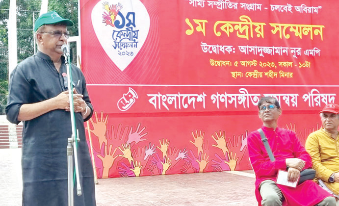 সংস্কৃতি প্রতিমন্ত্রী কেএম খালিদ বলেছেন, গণসংগীতের মধ্য দিয়ে খুব সহজেই মানুষের কাছে পৌঁছানো যায়। গণসংগীত সাংস্কৃতিক সংগ্রামের অনন্য হাতিয়ার। সেই ভাষা আন্দোলন থেকে শুরু করে মহান মুক্তিযুদ্ধসহ সব গণতান্ত্রিক আন্দোলনে গণসংগীত আমাদের উদ্দীপ্ত করেছে। মুক্তিযুদ্ধের চেতনার বাংলাদেশকে টিকিয়ে রাখতে সংগীতের এ ধারাটি ছড়িয়ে দিতে হবে দেশের প্রতিটি প্রান্তে। গতকাল শনিবার সকালে রাজধানীর কেন্দ্রীয় শহীদ মিনারে ‘বাংলাদেশ গণসংগীত সমন্বয় পরিষদ’ এর প্রথম কেন্দ্রীয় সম্মেলন ২০২৩ -এ প্রধান অতিথির বক্তব্যে এসব কথা বলেন। কেএম খালিদ বলেন, গণসংগীত বলতে আমরা ফকির আলমগীরকেই বুঝি। তিনি বাংলা গণসংগীতে নতুন মাত্রা যোগ করেছেন এবং এটিকে জনপ্রিয় করার ক্ষেত্রে গুরুত্বপূর্ণ ভূমিকা রেখেছেন। প্রতি বছর পহেলা বৈশাখের অনুষ্ঠানে ফকির আলমগীর প্রবর্তিত ঋষিজ শিল্পী গোষ্ঠী বিভিন্ন পরিবেশনার মাধ্যমে দেশীয় সংস্কৃতির বিকাশে অবদান রেখে চলেছে। প্রতিমন্ত্রী এ সময় বাংলাদেশ গণসংগীত সমন্বয় পরিষদ-এর প্রথম কেন্দ্রীয় সম্মেলনের সর্বাঙ্গীন সাফল্য কামনা করেন সম্মেলন উদ্বোধন করেন বিশিষ্ট সাংস্কৃতিক ব্যক্তিত্ব ও সংসদ সদস্য আসাদুজ্জামান নূর। আসাদুজ্জামান নূর বলেন, গণসংগীতের ইতিহাস সুদীর্ঘ। ব্রিটিশবিরোধী আন্দোলন ও মহান মুক্তিযুদ্ধসহ বিভিন্ন প্রগতিশীল আন্দোলনে গণসংগীতের অসামান্য অবদান রয়েছে। কিন্তু দুঃখজনক বিষয় হলো, গণসংগীতের সমৃদ্ধ ইতিহাস সঠিকভাবে লিপিবদ্ধ হয়নি। জাতির পিতা বঙ্গবন্ধু হত্যাকাণ্ড পরবর্তীকালে গণসংগীতের প্রতিবাদের ভাষা আরো সক্রিয় হয়েছে। সাম্প্রদায়িকতা ও বৈষম্যের বিরুদ্ধে গণসংগীত শিল্পীরা বরাবরই সোচ্চার ভূমিকা পালন করেছে। বাংলাদেশ গণসংগীত সমন্বয় পরিষদের ভারপ্রাপ্ত সভাপতি কাজী মিজানুর রহমানের সভাপতিত্বে অনুষ্ঠানে আরো বক্তব্য রাখেন সম্মিলিত সাংস্কৃতিক জোটের সভাপতি গোলাম কুদ্দুছ, স্বাধীন বাংলা বেতার কেন্দ্রের শিল্পী বীর মুক্তিযোদ্ধা তিমির নন্দী, সম্মিলিত সাংস্কৃতিক জোটের সাধারণ সম্পাদক মো. আহকাম উল্লাহ, বাংলাদেশে গণসংগীত সমন্বয় পরিষদের সাধারণ সম্পাদক মানজার চৌধুরী সুইট প্রমুখ।