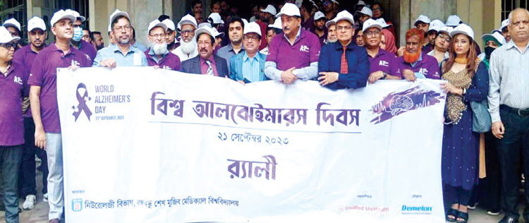 আলঝাইমার্স বা ডিমেনশিয়া রোগের মূল লক্ষণ সব জিনিস ভুলে যাওয়া। মারাত্মক এই রোগ সম্পর্কে যথেষ্ট জ্ঞান ও সচেতনতা জরুরি বলে জানিয়েছেন বঙ্গবন্ধু শেখ মুজিব মেডিকেল বিশ্ববিদ্যালয়ের (বিএসএমএমইউ) উপাচার্য অধ্যাপক ডা. শারফুদ্দিন আহমেদ। সেই সঙ্গে বৈশ্বিক মহামারি করোনার পর এই রোগে আক্রান্তের সংখ্যাও বেড়েছে বলেও জানিয়েছেন তিনি। গতকাল বৃহস্পতিবার বিশ্ব আলঝাইমার্স (ডিমেনশিয়া) দিবস উপলক্ষ্যে বিএসএমএমইউর নিউরোলজি বিভাগ আয়োজিত বর্ণাঢ্য শোভাযাত্রায় অংশ নিয়ে এ কথা জানান তিনি।