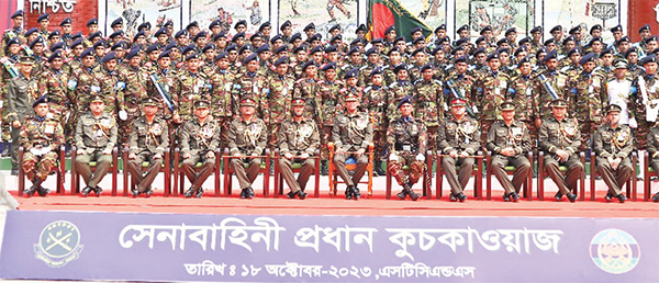 কোর অব সিগন্যালস্ রিক্রুট ব্যাচ-২০২৩-এর ‘সেনাবাহিনী প্রধান কুচকাওয়াজ’ অনুষ্ঠান গত বুধবার (সিগন্যাল ট্রেনিং সেন্টার অ্যান্ড স্কুল, যশোর সেনানিবাসে অনুষ্ঠিত হয়। অনুষ্ঠানে জেনারেল অফিসার কমান্ডিং (জিওসি) ৫৫ পদাতিক ডিভিশন ও এরিয়া কমান্ডার যশোর এরিয়া মেজর জেনারেল মোহাম্মদ মাহবুবুর রশীদ প্রধান অতিথি হিসেবে উপস্থিত থেকে কুচকাওয়াজ পরিদর্শন ও অভিবাদন গ্রহণ করেন। নান্দনিক ও চৌকষ প্যারেডের মাধ্যমে কোর অব সিগন্যালস্-এর ৫৯৭ জন রিক্রুট (পুরুষ ৫৬৯ জন ও মহিলা ২৮ জন) বাংলাদেশ সেনাবাহিনীতে নবীন সৈনিক হিসেবে যোগদান করল। অনুষ্ঠানে প্রধান অতিথি বাংলাদেশ সেনাবাহিনীর গৌরবোজ্জ্বল ঐতিহ্য ও দেশমাতৃকার সেবায় এ বাহিনীর অবদানের কথা উল্লেখ করার পাশাপাশি আধুনিক ও যুগোপযুগী প্রশিক্ষণের মাধ্যমে দক্ষতা অর্জন করে একবিংশ শতাব্দীর কঠিন চ্যালেঞ্জ মোকাবিলায় প্রস্তুত থাকার জন্য নবীন সৈনিকদের প্রতি আহ্বান জানান। অনুষ্ঠানে ঊর্ধ্বতন সেনাকর্মকর্তাগণ ছাড়াও অন্যান্য অফিসার, জুনিয়র কমিশন্ড অফিসার, অন্যান্য পদবির সৈনিকবৃন্দ এবং আমন্ত্রিত অতিথিবৃন্দ উপস্থিত ছিলেন। - আইএসপিআর