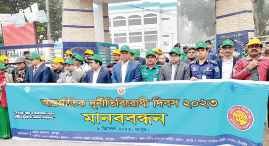 রংপুরে বিভিন্ন কর্মসূচির মধ্যে দিয়ে আন্তর্জাতিক দুর্নীতিবিরোধী দিবস-২০২৩ পালন হয়েছে। গতকাল শনিবার সকাল সাড়ে ৮টায় জেলা প্রশাসন কার্যালয়ে রংপুর জেলা প্রশাসন ও দুর্নীতি দমন কমিশনের (দুদক) আয়োজনে ও জেলা দুর্নীতি প্রতিরোধ কমিটি, রংপুর ও সচেতন নাগরিক কমিটির সহযোগিতায় রংপুরে আন্তর্জাতিক দুর্নীতিবিরোধী দিবস পালিত হয়েছে। অনুষ্ঠানে প্রধান অতিথি হিসেবে উপস্থিত ছিলেন রংপুর বিভাগীয় কমিশনার হাবিবুর রহমান। এ সময় জেলা প্রশাসক মোহাম্মদ মোবাশ্বের হাসানের সভাপতিত্বে বিশেষ অতিথি হিসেবে উপস্থিত ছিলেন রংপুর রেঞ্জ ডিআইজি আব্দুল বাতেন, রংপুর মেট্রোপলিটন পুলিশের অতিরিক্ত পুলিশ কমিশনার সামসুজ্জামান ফারুকি, পুলিশ সুপার ফেরদৌস আলী চৌধুরী, দুর্নীতি দমন কমিশনের পরিচালক আব্দুল করিম।