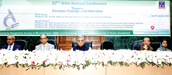 ‘জলবায়ু পরিবর্তন এবং জীবাণু’ প্রতিপাদ্য নিয়ে বাংলাদেশ সোসাইটি অব মাইক্রোবায়োলজিস্টসয়ের (বিএসএম) ৩৭তম বার্ষিক সম্মেলন শুরু হয়েছে। গতকাল ঢাকা বিশ্ববিদ্যালয়ের নবাব নওয়াব আলী চৌধুরী সিনেট ভবনে বিশ্ববিদ্যালয়ের উপাচার্য অধ্যাপক ড. এএসএম মাকসুদ কামাল প্রধান অতিথি হিসেবে উপস্থিত থেকে দুই দিনব্যাপী এই সম্মেলন উদ্বোধন করেন।