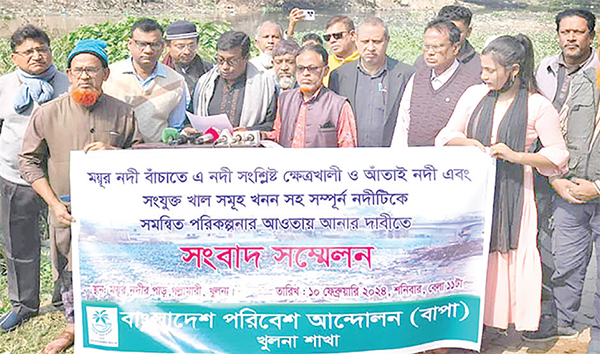 খুলনার ময়ূর নদ বাঁচানোর দাবিতে সংবাদ সম্মেলন করেছে পরিবেশবাদী নাগরিক সংগঠন বাংলাদেশ পরিবেশ আন্দোলন (বাপা)। গতকাল শনিবার দুপুরে নগরীর গল্লামারী নদের পাড়ে এই সংবাদ সম্মেলন অনুষ্ঠিত হয়। সংবাদ সম্মেলনে লিখিত বক্তব্য পাঠ করেন সংগঠনের খুলনা জেলার সমন্বয়কারী অ্যাডভোকেট মো. বাবুল হাওলাদার। সংবাদ সম্মেলনে জানানো হয়, খুলনা সিটি কর্পোরেশন ‘জলাবদ্ধতা নিরসনে ড্রেনেজ ব্যবস্থাপনার উন্নয়ন প্রকল্পের আওতায় ময়ূর নদের বয়রা শ্মশানঘাট হতে সাচিবুনিয়া ব্রিজ এবং ক্ষেত্রখালী খুদিয়া নদীর আড়ংঘাটা কালভার্ট থেকে বয়রা শ্মশানঘাট পর্যন্ত মোট সাড়ে ৫ কিলোমিটার নদী খনন প্রকল্প গ্রহণ করেছে, যার কাজ চলমান। কিন্তু এ নদটি বিল ডাকাতিয়া থেকে উৎপত্তি হয়ে ক্ষেত্রখালী/খুদিয়া নাম ধারণ করে, বয়রা শ্মশানঘাট এলাকায় এসে নাম পরিবর্তিত হয়ে, ময়ূর নদ নাম ধারণ করে বুড়ো মৌলভীর দরগাহ সংলগ্ন ত্রিমোহনীতে এসে পুনরায় নাম পরিবর্তিত হয়ে, হাতিয়া নাম ধারণ করে আলুতলা এলাকায় রূপসা নদীতে পড়েছে। মূলত খুলনা মহানগরীর জলাবদ্ধতা নিরসনের বিষয়টি বিবেচনায় নিয়ে এ প্রকল্পটি গ্রহণ করা হয়েছে। কিন্তু ময়ূর নদটি বাঁচাতে খুলনাবাসীর দীর্ঘদিনের দাবি উপেক্ষিত রয়ে গেছে। একটি নদীর আংশিক খনন করে তার প্রবাহ নিশ্চিত করা বা বাঁচানো সম্পূর্ণ বাস্তবতা পরিপন্থি। শুধু তাই নয়, আংশিক খননের ফলে জলাবদ্ধতা নিরসনের বিষয়টিও যথেষ্ট প্রশ্নবিদ্ধ থেকে যায়। সংবাদ সম্মেলনে আরো বলা হয়, সমগ্র নদটি একটি সমন্বিত পরিকল্পনার আওতায় এনে আলুতলাস্থ ১০ গেট থেকে বিল ডাকাতিয়া পর্যন্ত প্রায় ২০ কিলোমিটার দীর্ঘ এ নদটি এবং এর সংযুক্ত খালসমূহ খনন করে উজান এবং ভাটিতে সমান প্রবাহ নিশ্চিত করা প্রয়োজন। অন্যথায় এ প্রকল্পের কাজ শুধুমাত্র অর্থ অপচয় হবে বলেই ধারণা করা হচ্ছে। তিনি বলেন, ময়ূর নদ খনন প্রকল্পের চলমান খনন কাজ পানি শুকিয়ে ভেকু ও শ্রমিক দিয়ে মাটি কাটার কথা থাকলেও অনেক ক্ষেত্রে পানি না সেচে পানির মধ্যেই খনন কাজ চলায় এ প্রকল্পের উদ্দেশ্য কতটা বাস্তবায়িত হবে সে বিষয় আমরা যথেষ্ট সন্দিহান।