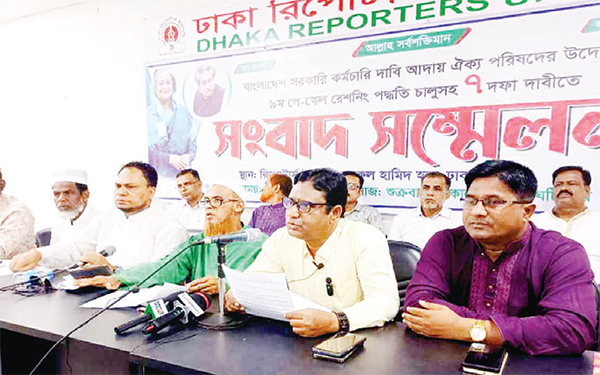 সরকারি কর্মচারীদের জন্য ঘোষিত ৫ শতাংশ বিশেষ ভাতার আদেশ পুনর্বিবেচনা এবং নবম পে-স্কেল, রেশনিং পদ্ধতি চালুসহ সাত দফা দাবি জানিয়েছে বাংলাদেশ সরকারি কর্মচারী দাবি আদায় ঐক্য পরিষদ। দাবি আদায়ে মানববন্ধন, প্রধানমন্ত্রীর কাছে স্মারকলিপি প্রদানসহ নানা কর্মসূচি ঘোষণা করেছে তারা। গতকাল শুক্রবার রাজধানীর সেগুনবাগিচায় ঢাকা রিপোর্টার্স ইউনিটির (ডিআরইউ) নসরুল হামিদ মিলনায়তনে আয়োজিত এক সংবাদ সম্মেলনে এ ঘোষণা দেওয়া হয়। এতে লিখিত বক্তব্য তুলে ধরেন সরকারি কর্মচারী দাবি আদায় ঐক্য পরিষদে মূখ্য সমন্বয়ক মো. ওয়ারেছ আলী। তিনি বলেন, বাংলাদেশ সরকারি কর্মচারী দাবি আদায় ঐক্য পরিষদের ৭ দফা দাবি বাস্তবায়নে দীর্ঘদিন কাজ করে যাচ্ছে। এ সংগঠনের ব্যানারে ২০১৯ সন থেকে সংবাদ সম্মেলন, স্মারকলিপি প্রদান, মানববন্ধন, বিভাগীয় সমাবেশসহ বিভিন্ন কর্মসূচি পালন করা হয়েছে। সর্বশেষ ২০২৩ সালের ২৬ মে কেন্দ্রীয় শহীদ মিনারে মহাসমাবেশ অনুষ্ঠিত হওয়ার কথা ছিল। সে সময় প্রধানমন্ত্রী প্রজাতন্ত্রের কর্মচারীদের বেতন বৃদ্ধির বিষয় জানান ও তৎকালীন জনপ্রশাসন প্রতিমন্ত্রী বর্তমানে মন্ত্রীর সাথে বেতন বৃদ্ধি ও ভাতাদির অসংগতি দূর করার আশ্বাসমূলক আলোচনা হয়। এর পরিপ্রেক্ষিতে মহাসমাবেশে কর্মসূচি স্থগিত করা হয়। কিন্তু আমাদের বেতন-ভাতাদি বৃদ্ধির সকল আশাকে নিরাশায় পরিণত করে সরকার ৫ শতাংশ বিশেষ সুবিধা প্রদান করে। বৈষম্য দূর করার দাবি জানিয়ে তিনি বলেন, সরকারের এ ঘোষণায় প্রজাতন্ত্রের ১১-২০ গ্রেডের কর্মচারিরা চরমভাবে হতাশ ও ক্ষুব্ধ। সরকারের দেওয়া ৫ শতাংশ বিশেষ সুবিধা বর্তমান বাজার ব্যবস্থার সাথে সামাঞ্জস্যপূর্ণ নয়। ৫ শতাংশ বিশেষ সুবিধায় ১১-২০ গ্রেডের কর্মচারীদের বৈষম্য আরও বৃদ্ধি হয়েছে। ১১-২০ গ্রেডের অধিকাংশ কর্মচারীদের মূল বেতন বিশ হাজার টাকার নিচে, তাদের আগামী ৪/৫ বছরেও বিশেষ সুবিধা সর্বনিম্ন এক হাজার টাকার ঊর্ধ্বে উঠবে না। অথচ ১-৯ গ্রেডের কর্মচারীদের এ সুবিধা চক্রবৃদ্ধি হারে বৃদ্ধি পেতে থাকবে। আমরা এ ধরনের বিশেষ সুবিধা চাইনি। আমরা চেয়েছি প্রধানমন্ত্রীর ঘোষণা অনুযায়ী ১১-২০ গ্রেডের কর্মচারীদের মূল বেতন বৃদ্ধি। যাতে কর্মচারীরা পরবর্তীতে এর সুবিধা পেতে পারে। তিনি আরও বলেন, যেখানে গার্মেন্টস শ্রমিক কর্মচারী ভাইদের বেতন ২০২৩ সালে আট হাজার থেকে সাড়ে ১২ হাজার করা হয়েছে। সেখানে সরকারি কর্মচারীদের সর্বনিম্ন গ্রেড ৮ হাজার ২৫০ টাকা। এটি অত্যন্ত অমানবিক বিষয় হয়ে দাঁড়িয়েছে। এ অবস্থায় সরকারের দেওয়া ৫ শতাংশ বিশেষ সুবিধা পুনর্বিবেচনা করে প্রধানমন্ত্রীর ঘোষণা অনুযায়ী বর্তমান সময়ের মুদ্রাস্ফীতির সাথে সংগতি রেখে তা মূল বেতনের সাথে সংযোজন ও সকল ভাতা যু