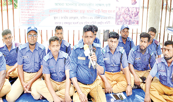 চাকরি জাতীয়করণসহ দুই দফা দাবি আদায়ে জাতীয় প্রেসক্লাবের সামনে লাগাতার অবস্থান কর্মসূচি পালন করছেন গ্রাম পুলিশের সদস্যরা। গতকাল শুক্রবার বঙ্গবন্ধু আদর্শ গ্রাম পুলিশ বাহিনী কেন্দ্রীয় কমিটির ব্যানারে পঞ্চম দিনের মতো এই অবস্থান কর্মসূচি পালন করতে দেখা যায় তাদের। এর আগে গত সোমবার (২৯ এপ্রিল) সকাল থেকে জাতীয় প্রেসক্লাবের সামনে অবস্থান কর্মসূচি শুরু করেন তারা।