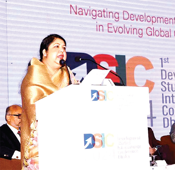 বাংলাদেশ জাতীয় সংসদের স্পিকার ড. শিরীন শারমিন চৌধুরী এমপি বলেছেন, বৈশ্বিক অর্থনীতির বিপর্যয়, মহামন্দা, রাশিয়া-ইউক্রেন যুদ্ধ এবং জলবায়ুর বিরূপ মোকাবিলা করেও বাংলাদেশ অর্থনৈতিক ক্ষেত্রে স্বতন্ত্র অবস্থানে রয়েছে। ডিজিটাল থেকে স্মার্ট বাংলাদেশ হওয়ার লক্ষ্যে দেশ এগিয়ে যাচ্ছে। গতকাল রোববার রাজধানী ঢাকার প্যান প্যাসিফিক সোনারগাঁও হোটেলের বলরুমে ঢাকা বিশ্ববিদ্যালয়ের উন্নয়ন অধ্যয়ন বিভাগ ও দৈনিক বণিক বার্তা কর্তৃক আয়োজিত ?‘ফার্স্ট ডেভেলপমেন্ট স্টাডিজ ইন্টারন্যাশনাল কনফারেন্স ২০২৪’ অনুষ্ঠানে প্রধান অতিথির বক্তব্যে তিনি এসব কথা বলেন। ঢাকা বিশ্ববিদ্যালয়ের উপাচার্য এএসএম মাকসুদ কামালের সভাপতিত্বে এবং উন্নয়ন অধ্যয়ন বিভাগের চেয়ারম্যান অধ্যাপক ড. রাশেদ আল মাহমুদ তিতুমীরের সঞ্চালনায় অনুষ্ঠানে বিশেষ অতিথির বক্তব্য প্রদান করেন অর্থ প্রতিমন্ত্রী ওয়াসিকা আয়েশা খান এমপি। স্পিকার ড. শিরীন শারমিন চৌধুরী বলেন, জাতির পিতা বঙ্গবন্ধু শেখ মুজিবুর রহমান মহান স্বাধীনতা অর্জনের পরই সংবিধান প্রণয়ন করেছিলেন যা গণতন্ত্রের জন্য আইনগত এবং পলিসি ফ্রেমওয়ার্ক হিসেবে কাজ করছে। গণতন্ত্রের প্রাতিষ্ঠানিকীকরণের মধ্য দিয়ে অর্থনৈতিক প্রবৃদ্ধি এবং সমাজব্যবস্থায় ইতিবাচক পরিবর্তন আনয়ন সম্ভব। স্বাধীনতার পর যুদ্ধবিধ্বস্ত বাংলাদেশ ব্যাংকে যখন রিজার্ভ ছিল না, মাত্র সাড়ে ৩ বছরে বঙ্গবন্ধু বাংলাদেশকে পুনর্গঠন করেছিলেন এবং একটি উন্নত সমৃদ্ধ সোনার বাংলাদেশ গড়ার স্বপ্ন দেখেছিলেন। তিনি বলেন, প্রধানমন্ত্রী শেখ হাসিনার দূরদর্শী নেতৃত্বে বাংলাদেশ স্বল্পোন্নত দেশ থেকে উন্নয়নশীল দেশে উন্নীত হতে চলেছে। নিজস্ব অর্থায়নে পদ্মা সেতুর মতো মেগা প্রজেক্ট বাস্তবায়ন করে বাংলাদেশ সারাবিশ্বে নিজের সক্ষমতা প্রমাণ করেছে। মেট্রোরেল, এলিভেটেড এক্সপ্রেসওয়ে, বঙ্গবন্ধু টানেল, গভীর সমুদ্রবন্দর ও আন্তঃমহাদেশীয় যোগাযোগ স্থাপনের মধ্য দিয়ে বর্তমান সরকার প্রতিবেশী দেশগুলোতে নিজের অবস্থান উন্নত করেছে। স্পিকার বলেন, প্রধানমন্ত্রীর নেতৃত্বে সারাদেশে ১০০টি বিশেষ অর্থনৈতিক জোন প্রতিষ্ঠা এবং শতভাগ বিদ্যুতায়ন অর্জিত হয়েছে। সামাজিক নিরাপত্তা বেষ্টনীর আওতায় বয়স্ক ভাতা, বিধবা ভাতা, গর্ভবতী ও প্রসূতি মায়েদের ভাতা প্রদানের মাধ্যমে চরম দারিদ্রসীমার নিচে বসবাসকারী নারীদের অর্থনৈতিক ক্ষমতায়ন সম্ভব হয়েছে। তিনি বলেন, পোশাক শিল্পকারখানায় নারী শ্রমিকের প্রাধান্য, বিশ্বের বিভিন্ন দেশে বসবাসকারী বাংলাদেশের নানা পেশাজীবীর প্রেরিত রেমিট্যান্সে দেশের অর্থনীতির চাকা দুর্বার গতিতে এগিয়ে যাচ্ছে। ২০২১ সালের মধ্যে ডিজিটাল বাংলাদেশ বাস্তবায়ন এবং 