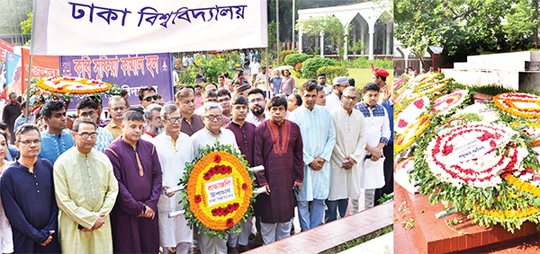 গতকাল শনিবার জাতীয় কবি কাজী নজরুল ইসলামের সমাধি প্রাঙ্গণে কবি’র ১২৫তম জন্মবার্ষিকী উপলক্ষ্যে আয়োজিত আলোচনা সভায় সভাপতির বক্তব্যে উপাচার্য যুদ্ধ বন্ধের এই আহ্বান জানান। জাতীয় কবি’র ১২৫তম জন্মবার্ষিকী উপলক্ষ্যে আজ সকালে অপরাজেয় বাংলার পাদদেশে থেকে উপাচার্য অধ্যাপক ড. এ এস এম মাকসুদ কামালের নেতৃত্বে বিশ্ববিদ্যালয়ের শিক্ষক-শিক্ষার্থী, কর্মকর্তা-কর্মচারীরা শোভাযাত্রা সহকারে কবির সমাধিতে গমন, পুষ্পস্তবক অর্পণ ও ফাতেহা পাঠ করেন। এ সময় বিশ্ববিদ্যালয়ের প্রো-ভাইস চ্যান্সেলর (প্রশাসন) অধ্যাপক ড. মুহাম্মদ সামাদ উপস্থিত ছিলেন। শ্রদ্ধা নিবেদন শেষে উপাচার্য অধ্যাপক ড. এ এস এম মাকসুদ কামালের সভাপতিত্বে কবির সমাধি প্রাঙ্গণে এক আলোচনা সভা ও সংগীতানুষ্ঠান অনুষ্ঠিত হয়।