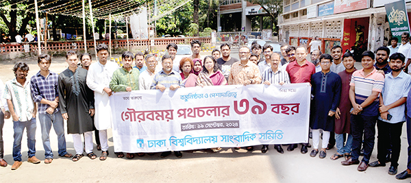 বিভিন্ন কর্মসূচির মধ্য দিয়ে গতকাল বৃহস্পতিবার ঢাকা বিশ্ববিদ্যালয় সাংবাদিক সমিতির ৩৯তম প্রতিষ্ঠাবার্ষিকী উদযাপন করা হয়েছে। এ উপলক্ষে বিশ্ববিদ্যালয়ের উপাচার্য অধ্যাপক ড. নিয়াজ আহমদ খান ছাত্র-শিক্ষক কেন্দ্রে আয়োজিত অনুষ্ঠানে প্রধান অতিথি হিসেবে উপস্থিত থেকে প্রতিষ্ঠাবার্ষিকীর কেক কাটেন। পরে উপাচার্যের নেতৃত্বে ছাত্র-শিক্ষক কেন্দ্র চত্বরে এক র্যালি বের করা হয়।