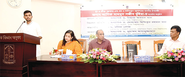 শ্রম ও কর্মসংস্থান মন্ত্রণালয়ের মাধ্যমে বেকারত্ব নিরসনে কাজ করছি। যুবসমাজকে দক্ষ করতে এবং ডেমোগ্রাফিক ডিভিডেন্টের সুবিধা নিতে যুব উন্নয়ন অধিদপ্তরের মাধ্যমে মাঠ পর্যায়ে বিভিন্ন প্রশিক্ষণের ব্যবস্থা গ্রহণ করা হচ্ছে। দেশের বিভিন্ন নীতিনির্ধারণী ক্ষেত্রে আমরা বিশ্ববিদ্যালয়ের শিক্ষকদের সাহায্য কামনা করছি। এ সময় উপস্থিত ছিলেন ঢাকা বিশ্ববিদ্যালয়ের উপাচার্য অধ্যাপক ড. নিয়াজ আহমেদ খান, কলা অনুষদের ডিন অধ্যাপক ড. মোহাম্মদ ছিদ্দিকুর রহমান খান, ভাষাবিজ্ঞান বিভাগের চেয়ারম্যান ড. মনিরা বেগমসহ ভাষাবিজ্ঞান বিভাগের শিক্ষক এবং শিক্ষার্থীরা।