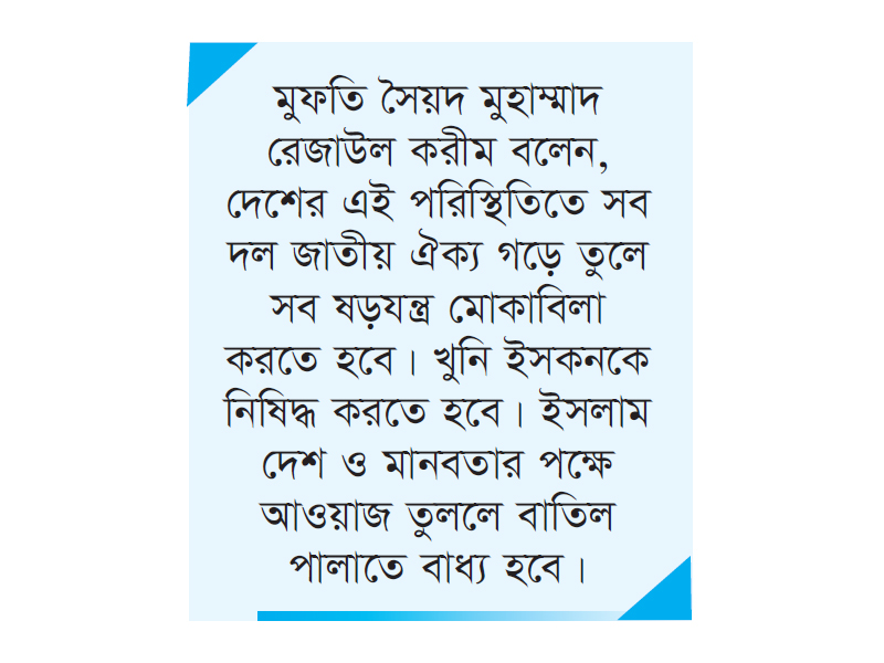 ইসলামী আন্দোলন বাংলাদেশের আমির ও চরমোনাই দরবার শরিফের পীর মুফতি সৈয়দ মুহাম্মাদ রেজাউল করীম ভারতকে প্রশ্ন ছুড়ে দিয়ে বলেছেন, বাংলাদেশ নিয়ে গভীর ষড়যন্ত্র চলছে। আমাদের দেশ নিয়ে ভারতের পার্লামেন্টে আলোচনা হবে কেন? আমরা কি স্বাধীন দেশের নাগরিক নয়? হিন্দুরা এ দেশের নাগরিক। তাদের ভালো-মন্দ আমরা দেখব। এটা নিয়ে অন্য দেশে আলোচনা হবে কেন? গতকাল শুক্রবার দুপুরে চরমোনাই মাহফিল ময়দানে ইসলামী ছাত্র আন্দোলন বাংলাদেশ আয়োজিত ছাত্র গণজমায়েতে প্রধান অতিথির বক্তব্যে তিনি এসব কথা বলেন। মুফতি সৈয়দ মুহাম্মাদ রেজাউল করীম বলেন, দেশের এই পরিস্থিতিতে সকল দল জাতীয় ঐক্য গড়ে তুলে সব ষড়যন্ত্র মোকাবিলা করতে হবে। খুনি ইসকনকে নিষিদ্ধ করতে হবে। ইসলাম দেশ ও মানবতার পক্ষে আওয়াজ তুললে বাতিল পালাতে বাধ্য হবে। ইসলামী ছাত্র আন্দোলন বাংলাদেশের কেন্দ্রীয় সভাপতি নূরুল বশর আজিজীর সভাপতিত্বে গণজমায়েতে বিশেষ অতিথি হিসেবে বক্তব্য দেন ইসলামী আন্দোলন বাংলাদেশ’র মহাসচিব অধ্যক্ষ হাফেজ মাওলানা ইউনুছ আহমাদ, যুগ্ম মহাসচিব মাওলানা গাজী আতাউর রহমান, ইঞ্জিনিয়ার আশরাফুল আলম, জাতীয় শিক্ষক ফোরামের কেন্দ্রীয় সভাপতি অধ্যাপক নাসির উদ্দীন, ইসলামী যুব আন্দোলনের কেন্দ্রীয় সভাপতি নেছার উদ্দীন, ইসলামী ছাত্র আন্দোলন বাংলাদেশ’র সাবেক কেন্দ্রীয় সভাপতি অ্যাডভোকেট বরকত উল্লাহ লতিফ, অ্যাডভোকেট হাছিবুল ইসলাম, জিএম রুহুল আমীন, শেখ ফজলুল করীম মারুফ, শরিফুল ইসলাম রিয়াদসহ কেন্দ্রীয় নেতারা। এ ছাড়া আজ চরমোনাই ময়দানে দেশের সর্ববৃহৎ জুমার জামাত অনুষ্ঠিত হয়েছে। হাজার হাজার মুসল্লির এই জামায়াতে ইমামতি ও খুতবা প্রদান করেন শায়খে চরমোনাই মুফতি সৈয়দ মুহাম্মাদ ফয়জুল করীম। আজ শনিবার সকাল সাড়ে ৮টায় আখেরি বয়ানের মধ্য দিয়ে তিন দিনব্যাপী এ মাহফিল শেষ হবে। চরমোনাই মাহফিল মিডিয়া উপ-কমিটির সদস্য কে এম শরীয়াতুল্লাহ জানিয়েছেন, মাহফিলে আসা মুসল্লিদের মধ্যে গত বৃহস্পতিবার দুইজন বার্ধক্যজনিত কারণে মৃত্যুবরণ করেন। তাদের জানাজা শেষে মাহফিল হাসপাতালের নিজস্ব অ্যাম্বুলেন্সে স্বজনদের কাছে লাশ হস্তান্তর করা হয়।