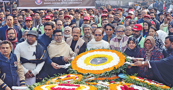 বাংলাদেশ উন্মুক্ত বিশ্ববিদ্যালয়ে (বাউবি) যথাযোগ্য মর্যাদায় শহীদ বুদ্ধিজীবী দিবস পালন উপলক্ষে বিভিন্ন কর্মসূচি পালিত হয়। এসব কর্মসূচির মধ্যে ছিল শহীদ বুদ্ধিজীবীদের স্মৃতির প্রতি গভীর শ্রদ্ধা নিবেদন। গতকাল শনিবার উপাচার্য অধ্যাপক ড. এবিএম ওবায়দুল ইসলামের নেতৃত্বে সকাল ৮টায় মিরপুর শহীদ বুদ্ধিজীবী স্মৃতিসৌধে এবং সকাল ১০টায় রায়ের বাজার শহীদ বুদ্ধিজীবী স্মৃতিসৌধে পুষ্পার্ঘ্য অর্পণ করা হয়। এ সময় উপ-উপাচার্য (প্রশাসন) অধ্যাপক সাঈদ ফেরদৌস পিএইচডি রেজিস্ট্রার, ডিন, পরিচালক, শিক্ষক, কর্মকর্তা ও কর্মচারীবৃন্দ উপস্থিত ছিলেন। কর্মসূচির অংশ হিসেবে বিশ্ববিদ্যালয়ের গাজীপুর ক্যাম্পাসে গতকাল সকাল সাড়ে ৬টায় উপাচার্য অধ্যাপক ড. এবিএম ওবায়দুল ইসলামের পক্ষে থেকে শিক্ষক, কর্মকর্তা ও কর্মচারীদের নিয়ে উপ-উপাচার্য (প্রশাসন) অধ্যাপক সাঈদ ফেরদৌস পিএইচডি জাতীয় পতাকা অর্ধনমিত ও কালো পতাকা উত্তোলণ করেন।