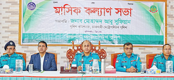 রাজশাহী মেট্রোপলিটন পুলিশের উদ্যোগে মাসিক কল্যাণ সভা অনুষ্ঠিত হয়েছে। গতকাল মঙ্গলবার সকালে রাজশাহী পুলিশ লাইন্স ড্রিল শেডে সকাল ১০টায় শুরু হওয়া এই সভায় সভাপতিত্ব করেন আরএমপি পুলিশ কমিশনার মোহাম্মদ আবু সুফিয়ান। আরএমপি পুলিশ কমিশনার মোহাম্মদ আবু সুফিয়ান বলেন, অফিসার ও ফোর্সদের উত্তম পোশাক পরিধান করা, স্বাস্থ্য সচেতনতা, পরিষ্কার পরিচ্ছন্নতা এবং জনসাধারণের সাথে উত্তম ব্যবহারসহ বিভিন্ন দিকনির্দেশনামূলক বক্তব্য প্রদান করেন। এছাড়া পুলিশ সদস্যদের নিজের জানমালের নিরাপত্তার পাশাপাশি অর্পিত দায়িত্ব নিষ্ঠা ও পেশাদারিত্বের সাথে পালনের জন্য নির্দেশ প্রদান করেন। সভা শেষে রাজশাহী মেট্রোপলিটন পুলিশ থেকে অবসর গ্রহণ করা সদস্যদের সম্মাননা জানানো হয়। বিদায় সংবর্ধনা অনুষ্ঠানে ১ জন ইন্সপেক্টর, ১ জন টিএসআই ও ১ জন সিভিল স্টাফকে শুভেচ্ছা জানানো হয়। এ সময় বিদায়ী অতিথিদের হাতে শুভেচ্ছা স্মারক তুলে দেওয়া হয় এবং তাদের সুস্বাস্থ্য ও দীর্ঘায়ু কামনা করা হয়। বিদায়ী কর্মকর্তাদের প্রতি সম্মান প্রদর্শন এই আয়োজনকে আরও মানবিক ও স্মরণীয় করে তোলে। এ সময় উপস্থিত ছিলেন আরএমপির নগর বিশেষ শাখার বিশেষ পুলিশ সুপার (অতিরিক্ত ডিআইজি পদে পদোন্নতিপ্রাপ্ত) কে. এম. আরিফুল হক, বিভাগের উপ-পুলিশ কমিশনার (অতিরিক্ত ডিআইজি পদে পদোন্নতিপ্রাপ্ত) বিভূতি ভূষন বানার্জী, উপ-পুলিশ কমিশনার (সদর) মো: সাইফউদ্দীন শাহীন প্রমুখ।