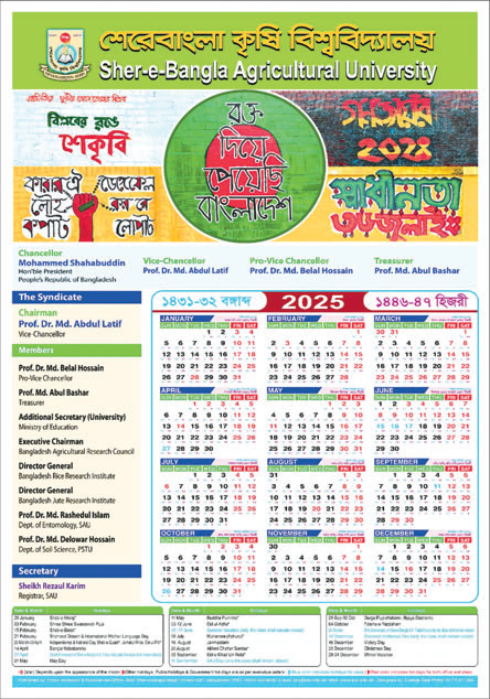 শেরেবাংলা কৃষি বিশ্ববিদ্যালয়ের (শেকৃবি) ২০২৫ সালের ওয়াল ক্যালেন্ডার গতকাল মঙ্গলবার প্রকাশ করা হয়। ক্যালেন্ডারটি ডিজাইন করা হয় ২০২৪ সালে সংঘটিত রক্তাক্ত ‘জুলাই অভ্যুত্থান’ উপলক্ষে শেকৃবির বিভিন্ন দেয়ালে শিক্ষার্থীদের হাতে আঁকা গ্রাফিতির সমন্বয়ে। ক্যালেন্ডারটিতে দেখা যায়, মোট পাঁচটি গ্রাফিতির ছবি কোলাজ করে ক্যালেন্ডারের উপরের অংশে স্থান দেয়া হয়েছে। মাঝখানে বৃত্তে ঘেরা লাল-সবুজের উপর কালো কালিতে আঁকা হয়েছে ‘রক্ত দিয়ে পেয়েছি বাংলাদেশ’। ডানপাশে উপরের অংশে কালো ব্যাকগ্রাউন্ডের উপর লাল ও হলুদ কালিতে আঁকা হয়েছে ‘গণজোয়ার ২০২৪’। ঠিক এর নিচের ছবিতেই দেখা যায়, হলুদ ব্যাকগ্রাউন্ডের উপর সবুজ ও লাল কালিতে আঁকা হয়েছে ‘স্বাধীনতা ৩৬ জুলাই ২৪’। বামপাশে নিচের ছবিতে দেখা যায়, হলুদ ব্যাকগ্রাউন্ডের উপর লাল কালিতে আঁকা হয়েছে মুষ্টিবদ্ধ হাতে চারটি কালো শিকল। হাতটির বামপাশে কালো ও লাল কালিতে আঁকা হয়েছে ‘কারার ঐ লৌহ কপাট’ এবং ডানপাশে আঁকা হয়েছে ‘ভেঙে ফেল কররে লোপাট’। বামপাশে উপরের ছবিতে দেখা যায়, আকাশি রঙের র্যাকগ্রাউন্ডের উপরের অংশে আঁকা ‘গ্রাফিতিতে ফুটিয়ে তোলো তোমার বিপ্লব’।