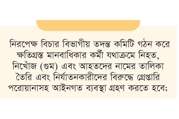 স্থগিত নিবন্ধনগুলো পুনরায় চালু করতে হবে। এছাড়া স্বৈরাচার সরকারের দোসর সরকারি কর্মকর্তা ও কর্মচারী এবং ফরমায়েশি বিচারপতি ও বিচারকদের তালিকা তৈরি করে অবিলম্বে তাদের অপসারণ করতে হবে; মৃত্যুদণ্ড আইন বাংলাদেশে বাতিল-রোহিত করতে হবে: যাবত জীবন কারাদণ্ড আইন সংশোধন করতে হবে এবং ৯০ কর্ম দিবসের মধ্যে বিচার কাজ সম্পূর্ণ করতে হবে। সংবাদ সম্মেলনে বলা হয়, উপস্থাপিত ৯টি দাবি মানবাধিকার কর্মীদের নিরাপত্তাসহ সারা দেশে ১৭ কোটি মানুষের দাবি হিসেবে উপস্থাপন করা হয়েছে। এই দাবি বর্তমান অন্তর্বর্তীকালীন সরকারকে আগামী ৪ সপ্তাহের মধ্যে মেনে নেয়ার জোর আহ্বান জানাচ্ছি।