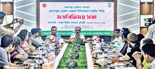 তামাক নিয়ন্ত্রণ আইন শক্তিশালীকরণের মাধ্যমে শতভাগ ধূমপানমুক্ত পরিবেশ নিশ্চিত করতে হোটেল ও রেস্তোরাঁয় স্মোকিং জোন রাখার বিধান বাতিলের দাবি জানিয়েছে ঢাকা বিভাগের হোটেল-রেস্তোরাঁর মালিকরা। গত রবিবার বিকালে ঢাকা বিভাগীয় কমিশনারের কার্যালয়ে ঢাকা আহ্ছানিয়া মিশন আয়োজিত ‘জনস্বাস্থ্য সুরক্ষায় শতভাগ ধূমপানমুক্ত হোটেল-রেস্তোরাঁ নিশ্চিতকরণে করণীয়’ শীর্ষক মতবিনিময় সভায় তারা আরও জানায় হোটেল-রেস্তোরাঁয় নারী-শিশুসহ অধূমপায়ীদের জন্য সুস্থ পরিবেশ নিশ্চিত করতে হলে আইন শক্তিশালীকরণের কোনো বিকল্প নাই। ঢাকা বিভাগীয় কমিশনার শরফ উদ্দিন আহমদ চৌধুরীর সভাপতিত্বে অনুষ্ঠানে আলোচক হিসেবে উপস্থিত ছিলেন অতিরিক্ত বিভাগীয় কমিশনার আজমল হোসেনসহ ঢাকার শতাধিক হোটেল-রেস্তোরাঁর মালিক ও প্রতিনিধিরা। এ সময় স্বাগত বক্তব্য রাখেন, ঢাকা আহ্ছানিয়া মিশনের স্বাস্থ্য সেক্টরের উপ-পরিচালক মোখলেছুর রহমান। সূত্র : সংবাদ বিজ্ঞপ্তি
