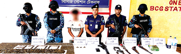 টেকনাফে কোস্ট গার্ড ও পুলিশের যৌথ অভিযানে বিপুল পরিমাণ দেশি-বিদেশি আগ্নেয়াস্ত্র, তাজা গোলা ও মাদক জব্দ এবং অপহরণকৃত ১ জন ব্যাক্তি উদ্ধার হয়েছে। গত রোববার সকালে কোস্ট গার্ড সদরদপ্তর মিডিয়া কর্মকর্তা লেফটেন্যান্ট কমান্ডার হারুন-অর-রশীদ এ তথ্য জানান। তিনি বলেন, গোপন সংবাদেরভিত্তিতে জানা যায়, টেকনাফ থানাধীন জাদিমুরা সংলগ্ন এলাকায় পাহাড়ে একদল সশস্ত্র ডাকাত বিপুল পরিমাণ অস্ত্রসহ অবস্থান করছে। প্রাপ্ত তথ্যেরভিত্তিতে গত শনিবার মধ্যরাত সাড়ে ১১টায় কোস্ট গার্ড স্টেশন টেকনাফ এবং পুলিশের সমন্বয়ে উক্ত এলাকায় একটি যৌথ অভিযান পরিচালনা করা হয়। অভিযান চলাকালীন ডাকাত দলের সদস্যরা যৌথ বাহিনীর উপস্থিতি টের পেয়ে এলোপাতাড়ি গোলাবর্ষণ শুরু করে। এসময় আত্মরক্ষার নিমিত্তে যৌথ বাহিনী ফাঁকা গোলা বর্ষণ করলে ডাকাত দলের সদস্যরা গহীন পাহাড়ে পালিয়ে যায়। সূত্র: সংবাদ বিজ্ঞপ্তি