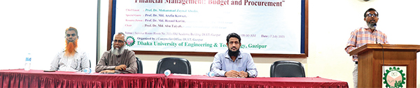 ঢাকা প্রকৌশল ও প্রযুক্তি বিশ্ববিদ্যালয় (ডুয়েট), গাজীপুরের উপাচার্য অধ্যাপক ড. মোহাম্মদ জয়নাল আবেদীন বলেছেন, ‘প্রশাসনিক স্বচ্ছতা ও দক্ষ আর্থিক ব্যবস্থাপনা বিশ্ববিদ্যালয়ের অন্যতম চালিকাশক্তি। আর্থিক ব্যবস্থাপনায় স্বচ্ছতা, জবাবদিহিতা ও সীমিত সম্পদের যথাযথ ব্যবহারের মাধ্যমে প্রাতিষ্ঠানিক সক্ষমতা বৃদ্ধি করতে হবে। আর্থিক শৃঙ্খলা ও প্রশাসনিক স্বচ্ছতার জন্য বাজেট প্রণয়ন, সরকারি ক্রয় প্রক্রিয়ার প্রতিটি ধাপেই দায়িত্বশীলতা, জবাবদিহিতা ও পেশাদারিত্ব বজায় রাখা অত্যন্ত গুরুত্বপূর্ণ। ডুয়েটের উন্নয়ন ও অগ্রযাত্রা নিশ্চিত করতে হলে আমাদের সকল পর্যায়ে পূর্বের অভিজ্ঞতা ও চ্যালেঞ্জ মোকাবিলা করে দক্ষতা ও সময়ানুবর্তিতা মেনে সব কাজ সুষ্ঠুভাবে সম্পন্ন করতে হবে। প্রযুক্তিনির্ভর জ্ঞান, বিধি-বিধান চর্চা এবং মানবিক নেতৃত্বের সমন্বয়ে আমরা যদি কাজ করি, তবে বিদ্যমান চ্যালেঞ্জগুলো মোকাবিলা করে অগ্রসর হওয়া যাবে।’ গতকাল সোমবার বিশ্ববিদ্যালয়ের পুরাতন একাডেমিক ভবনের ৩১১ নং সেমিনার কক্ষে অনুষ্ঠিত ‘ফিনান্সিয়াল ম্যানেজমেন্ট : বাজেট অ্যান্ড প্রকিউরমেন্ট’ বিষয়ক দিনব্যাপী কর্মশালায় প্রধান অতিথির বক্তব্যে তিনি এসব কথা বলেন। সূত্র: সংবাদ বিজ্ঞপ্তি