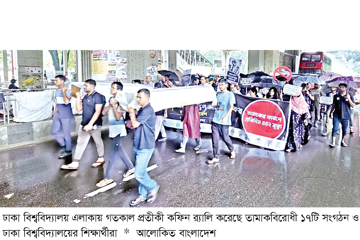 তামাকজনিত মৃত্যু ও তামাকের ব্যবহার কমাতে এবং তামাকমুক্ত সুস্থ জাতি গঠনে, তামাক নিয়ন্ত্রণ আইন সময় উপযোগী ও শক্তিশালীকরণের দাবিতে সমাবেশ ও প্রতীকী কফিন র্যালি করেছে তামাক বিরোধী ১৭টি সংগঠন ও ঢাকা বিশ্ববিদ্যালয়ের শিক্ষার্থীরা। গতকাল বুধবার ঢাকা বিশ্ববিদ্যালয়ের টিএসসি এলাকায় আয়োজিত সমাবেশে এমন দাবি জানায় তারা। সমাবেশ শেষে কফিন র্যালিটি বিশ্ববিদ্যালয় এলাকা প্রদক্ষিণ করে শেষ হয়।