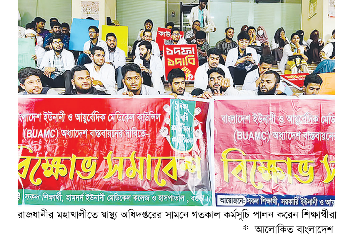 বাংলাদেশ ইউনানি ও আয়ুর্বেদিক চিকিৎসা শিক্ষা অর্ডিন্যান্স জারি এবং কাউন্সিল গঠনের একদফা দাবিতে স্বাস্থ্য অধিদপ্তরে গতকাল চতুর্থ দিনের মতো অবস্থান কর্মসূচি পালন করেছেন সরকারি ইউনানি ও আয়ুর্বেদিক মেডিকেল কলেজ এবং হামদর্দ ইউনানি মেডিকেল কলেজের শিক্ষার্থীরা। গতকাল বৃহস্পতিবার রাজধানীর মহাখালীতে স্বাস্থ্য অধিদপ্তরের সামনে এ কর্মসূচি পালন করেন তাঁরা। এ সময় দুই মেডিকেলের প্রায় ২৫০ জন শিক্ষার্থী ও শিক্ষক উপস্থিত ছিলেন। অবস্থান কর্মসূচিতে অংশ নেওয়া শিক্ষার্থী আহসান হাবীব বলেন, ১৯৯৬ সালের নীতিমালা অনুসারে স্বাস্থ্য অধিদপ্তর অস্থায়ী কাউন্সিল হিসেবে বিএএমএস ও বিইউএমএস চিকিৎসকদের রেজিস্ট্রেশন প্রদান করবে এবং বিএমডিসির আদলে একটি পৃথক কাউন্সিল গঠনের জন্য বলা হয়। কিন্তু আজ ২৯ বছর পার হওয়ার পরও কাউন্সিল গঠিত হয়নি। এতে চিকিৎসকেরা পেশাগত জীবনে বিভিন্ন সমস্যায় পড়ছেন। শিক্ষার্থীরা জানান, দাবি আদায় না হওয়া পর্যন্ত কর্মসূচি চালিয়ে যাবেন। আইন ও কাউন্সিল ছাড়া আন্দোলন থামবে না। দাবি মানা না হলে কঠোর আন্দোলনের হুঁশিয়ারি দেন তাঁরা। গত ৩০ জুন থেকে ক্যাম্পাসে শান্তিপূর্ণভাবে কর্মসূচি পালন করেন শিক্ষার্থীরা। এরপর ৭ জুলাই থেকে পৃথক আইন প্রণয়ন করে কাউন্সিল গঠনের দাবিতে স্বাস্থ্য শিক্ষা অধিদপ্তরের সামনে অবস্থান কর্মসূচি পালন করে আসছেন তাঁরা।