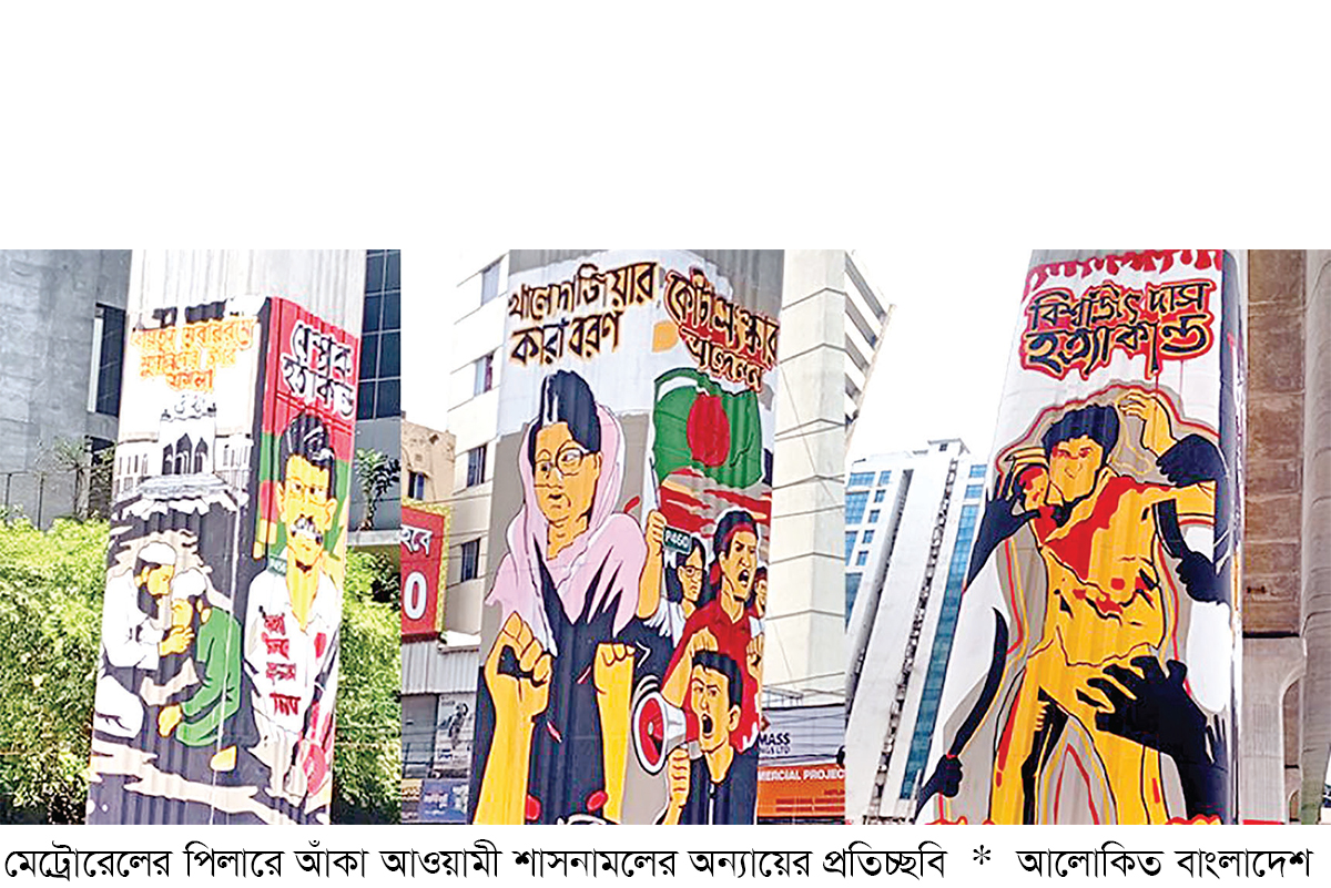 জুলাই গণঅভ্যুত্থানের বর্ষপূর্তিতে মেট্রোরেলের পিলারগুলোতে আঁকা হচ্ছে বিশেষ চিত্র। যেখানে ফুটে উঠেছে শেখ হাসিনার দেড় দশকের বিতর্কিত সব ঘটনার প্রতিচ্ছবি। যার শিরোনাম ফিরে দেখা ফ্যাসিস্ট রেজিম। এরমূল উদ্যোক্তা ঢাকা উত্তর সিটি কর্পোরেশন। সংশ্লিষ্টরা জানান, প্রথম ধাপে রাজধানীর কারওয়ান বাজার থেকে ফার্মগেট পর্যন্ত প্রতিটি পিলারেই আঁকার কাজ এরইমধ্যে শেষ হয়েছে। দ্বিতীয় ধাপে বিজয় সরণি থেকে চলবে আগারগাঁও স্টেশন পর্যন্ত। আগামী ৫ আগস্টের মধ্যে শেষ করতে টানা কাজ করছেন ঢাকা বিশ্ববিদ্যালয় ও জগন্নাথ বিশ্ববিদ্যালয়ের চারুকলার শিক্ষার্থীরা। এতে ২০০৯ থেকে ২৪ সাল পর্যন্ত সমালোচিত ইস্যুগুলো তুলে ধরা হয়েছে শিল্পকর্মের মাধ্যমে। অবশ্য ধারাবাহিকভাবে শাহবাগ থেকে মিরপুর-১০ পর্যন্ত হবে হবে এই গ্রাফিতি। একটি পিলারের এক পাশে সাল ও শিরোনাম এবং বাকি তিন পাশে রয়েছে এক বছরের সমালোচিত তিনটি ঘটনার খণ্ডচিত্র। নানা রঙের সংমিশ্রণে দৃষ্টিনন্দন এ চিত্রশৈলীতে উঠে এসেছে পিলখানা ট্র্যাজেডি, খালেদা জিয়ার কারাবরণ, সীমান্তের কাঁটাতারে ফেলানীর লাশ, শাপলা চত্বরে গণহত্যা, রাতের ভোট, তত্ত্বাবধায়ক সরকার বাতিল, সাগর-রুনি হত্যাকাণ্ড, রানা প্লাজা ধস, বিরোধী নেতাদের নির্বিচারে গ্রেপ্তার, কোটা সংস্কার ও নিরাপদ সড়ক আন্দোলনে হামলা, পুলিশি দমন-পীড়ন, তনু ধর্ষণ, প্রশ্নপত্র ফাঁস, পুরান ঢাকায় বিশ্বজিৎকে কুপিয়ে হত্যা, ক্যাঙারু কোর্ট, নিমতলিতে অগ্নিকাণ্ড, করোনার ভুয়া টেস্ট এবং ২৪-এর গণঅভ্যুত্থানের চিত্র। গতকাল শনিবার দুপুরে সরেজমিনে গিয়ে দেখা গেছে, তুলির আঁচরে আঁকা এসব চিত্র দেখছেন পথচারীরা। আর বাস যাত্রীদের অনেকেরই দৃষ্টি যেন সেদিকে। পথচারী রহমত উল্লাহ নীরব বলেন, এর মাধ্যমে বিগত সরকারের অপকর্মের চিত্র ফুটে উঠেছে। এটি নিজেদের জন্য বার্তা হিসেবে নিতে পারে আগামীতে রাষ্ট্র ক্ষমতায় আসা সরকার। তিনি এর জন্য সিটি কর্পোরেশনকে ধন্যবাদ জানান। বাংলাদেশ লিবারেল ডেমোক্রেটিক পার্টির চেয়ারম্যান ও সাবেক এমপি শাহাদত হোসেন সেলিম বলেন, ‘গ্রাফিতির মাধ্যমে বিগত ফ্যাসিস্ট সরকারের অন্যায় কাজগুলো চিত্রায়িত করা একটি ইতিবাচক উদ্যোগ। আশা করি এর মাধ্যমে ভবিষ্যতে অন্যরাও শিক্ষা নেবেন।’ ঢাকা উত্তর সিটি কর্পোরেশনের প্রশাসক মোহাম্মদ এজাজ জানান, ‘সিটি কর্পোরেশনের পক্ষ থেকে গ্রাফিতির উদ্যোগ নিলেও সম্পূর্ণ কাজ করছেন ঢাবি ও জবিসহ বিভিন্ন শিক্ষাপ্রতিষ্ঠানের শিক্ষার্থীরা। আমরা নামে মাত্র সহযোগিতা করছি। এ গ্রাফিতি অন্যদের জন্য বিশেষ বার্তা হিসেবে কাজ করবে বলে আমি মনে করি।’ তিনি বলেন, ‘প্রাথমিকভাবে কারওয়ানবাজার থেকে ফার্মগেট পর্যন্ত পিলারে গ্রাফিতি আঁকা হয়েছে। আগামী ৫ আগস্ট