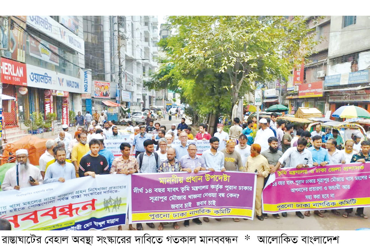 পুরান ঢাকার সূত্রাপুর মৌজায় দীর্ঘ ১৪ বছর যাবৎ খাসমহলের নামে খাজনা প্রদানে ভূমি মন্ত্রণালয়ের অবৈধ নিষেধাজ্ঞা প্রত্যাহারের দাবি এবং ঢাকা দক্ষিণ সিটি কর্পোরেশনের অবহেলা ও উদাসীনতার কারণে গেন্ডারিয়ার লোহারপুল তথা জহির রায়হান নাট্য মঞ্চ থেকে পোস্তগোলা পর্যন্ত রাস্তাঘাটের বেহাল অবস্থা যা সংস্কারের দাবিতে গতকাল রোববার এক বিশাল মানববন্ধনের আয়োজন করা হয়। মানববন্ধনের মাধ্যমে এই প্রতিবাদটির মূল লক্ষ্য ছিল সরকারকে জ্ঞাত করার মধ্য দিয়ে ঢাকা দক্ষিণের লাখ লাখ মানুষের দুঃখ-দুর্দশা ও দূর্ভোগ লাঘব করা। পুরান ঢাকা নাগরিক কমিটি ও এলাকাবাসীর উদ্যোগে এই শান্তিপূর্ণ মানববন্ধনে সংগঠনের সভাপতি শেখ ফজলুর রহমান বকুল, সংগঠনের সাধারণ সম্পাদক মাহবুবউদ্দিন চৌধুরী, মুজিবুর রহমান খান, রেজাউল করিম বাবু, সাংবাদিক একেএম মহসীন, মো. আবদুল মান্নান ও মাহবুবে মাওলা হিমেলসহ স্থানীয় বিভিন্ন রাজনৈতিক নেতারা বক্তব্য রাখেন। এ ছাড়াও পুরনো ঢাকার গেন্ডারিয়ার লোহারপুলস্থ জহির রায়হান নাট্য মঞ্চ থেকে পোস্তাগোলার সেনানিবাস পর্যন্ত সড়কের অবস্থা দীর্ঘদিন থেকে বেহাল। ভঙ্গুর, খানাখন্দকে ভরপুর এই রাস্তা দিয়ে চলাচল করাই দায় সাধারণ মানুষ, যানবাহন ও এলাকাবাসীদের। প্রতিদিনই এই রাস্তায় ঘটে চলছে অহরহ ছোট-বড় বহু দুর্ঘটনা। এটা রাস্তা তো নয়, যাতায়াতের নাম শুনলেই বুক কাঁপে এলাকাবাসীদের। অসুস্থ রোগী, স্কুলগামী কোমলমতি শিশু শিক্ষার্থী ও বয়স্কদের জন্য ভয়ানক ঝুঁকির মাঝে এই রাস্তা। বিগত ২ বছর যাবৎ এই এলাকার বিধ্বস্ত রাস্তা সংস্কারে ঢাকা দক্ষিণ সিটি কর্পোরেশনের অবহেলায় এলাকাবাসী চরম ক্ষুব্ধ।