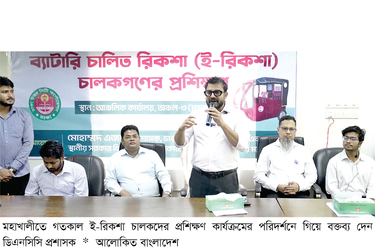 রিকশাচালকদের প্রশিক্ষণ প্রদানের ফলে তাদের রাষ্ট্রীয় স্বীকৃতি প্রদানের আইনগত ভিত্তি তৈরি হবে বলে মন্তব্য করেছেন ঢাকা উত্তর সিটি কর্পোরেশনের (ডিএনসিসি) প্রশাসক মোহাম্মদ এজাজ। তিনি বলেন, প্রশিক্ষণের আওতায় পর্যায়ক্রমে দুই লক্ষ্য রিকশাচালককে অন্তর্ভুক্ত করা হবে। পরবর্তীতে প্রতিটি অঞ্চলের জন্য ভিন্ন রঙের রিকশা অনুমোদন দেওয়া হবে। তখন একটি অঞ্চলের রিকশা আর অন্য অঞ্চলে চালানো যাবে না। গতকাল মঙ্গলবার মহাখালীতে ই-রিকশা চালকদের প্রশিক্ষণ কার্যক্রমের পরিদর্শন শেষে তিনি এ কথা বলেন। প্রশিক্ষণার্থীদের উদ্দেশ্যে প্রশাসক বলেন, ঢাকায় ব্যাটারিচালিত রিকশা চলাচলে শৃঙ্খলা আনার লক্ষ্যে ঢাকার দুই সিটি কর্পোরেশন একযোগে ই-রিকশা চালকদের প্রশিক্ষণ প্রদান করছে। প্রশিক্ষণের মাধ্যমে আমরা ই-রিকশাচালকদের একটি আইনি কাঠামোর আওতায় আনতে চাই। ডিএনসিসির এবং স্থানীয় সরকার বিভাগের উদ্যোগে গতকাল থেকে ঢাকা উত্তর সিটি কর্পোরেশন (ডিএনসিসি) এলাকায় ই-রিকশা চালকদের প্রশিক্ষণ কার্যক্রম শুরু হয়েছে। প্রথম দিনে রাজধানীর পাঁচটি ভেন্যুতে একযোগে এই প্রশিক্ষণ অনুষ্ঠিত হয়। মহাখালীর ডিএনসিসি জোনাল অফিসে দুটি, মোহাম্মদপুর সূচনা কমিউনিটি সেন্টারে একটি, মিরপুর ১০ এবং উত্তরায় একটি করে ভেন্যুতে প্রশিক্ষণ কার্যক্রম পরিচালিত হচ্ছে। প্রথম দিনে প্রায় ৬০০ ই-রিকশা চালক এই প্রশিক্ষণে অংশ নেন। এরমধ্যে মহাখালীতেই প্রশিক্ষণ নিচ্ছেন ২৩৭ জন চালক। আজ থেকে এসব ভেন্যুতে নিয়মিত প্রশিক্ষণ চলবে। মহাখালী ভেন্যু পরিদর্শনকালে ডিএনসিসি প্রশাসক মোহাম্মদ এজাজ প্রশিক্ষণার্থী চালকদের উদ্দেশ্যে বলেন, এ প্রশিক্ষণের ফলে দুর্ঘটনা কমবে এবং চালকরা আইন মানায় উৎসাহী হবেন। তিনি আরও বলেন, বর্তমানে শহরে যেসব, ঝুঁকিপূর্ণ ব্যাটারিচালিত রিকশা চলছে, সেগুলো ধাপে ধাপে ফেজ আউট করে বুয়েটের ডিজাইন অনুযায়ী মডেলের রিকশা নামানো হবে। প্রশিক্ষণের আওতায় পর্যায়ক্রমে দুই লক্ষ্য রিকশাচালককে অন্তর্ভুক্ত করা হবে। পরবর্তীতে প্রতিটি অঞ্চলের জন্য ভিন্ন রঙের রিকশা অনুমোদন দেওয়া হবে। তখন একটি অঞ্চলের রিকশা আর অন্য অঞ্চলে চালানো যাবে না। প্রশিক্ষণে ই-রিকশা চালকদের ট্রাফিক আইন, সড়ক নিরাপত্তা, দুর্ঘটনার কারণ, সাইন ও সংকেত, রিকশা চালনার কৌশল এবং ড্রাইভিং লাইসেন্স পাওয়ার প্রক্রিয়া সম্পর্কে ধারণা দেওয়া হচ্ছে। এই সেশনে ঢাকা মহানগর পুলিশের ট্রাফিক বিভাগও সহযোগিতা করছে। বুয়েটের যন্ত্রকৌশল বিভাগের নকশা অনুযায়ী ব্যাটারিচালিত ই-রিকশাগুলোর সর্বোচ্চ গতি নির্ধারণ করা হয়েছে ঘণ্টায় ৩০ কিলোমিটার। তবে নির্দিষ্ট এলাকায় এই গতিসীমা ১৫ থেকে ২০ কিলোমিটার হবে। স্থানীয় সরকার বিভাগের প্রণীত ‘বৈদ্যুতিক থ্র