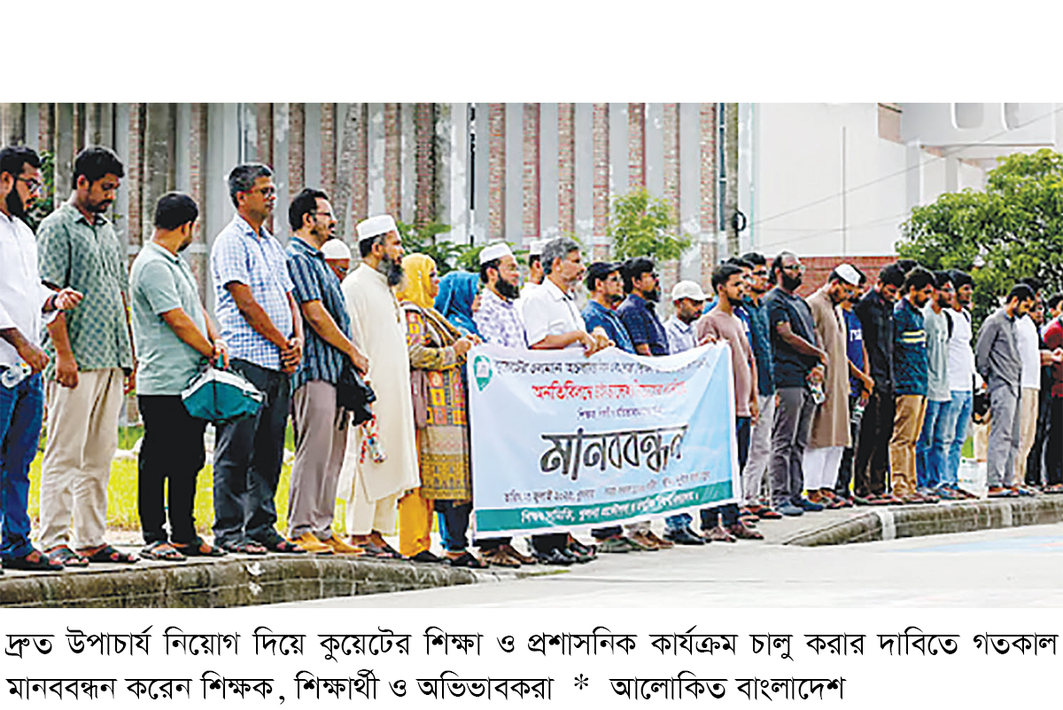 খুলনা প্রকৌশল ও প্রযুক্তি বিশ্ববিদ্যালয়ের (কুয়েট) অচলাবস্থা নিরসন ও দ্রুত শিক্ষা কার্যক্রম চালুর জন্য উপাচার্য নিয়োগের দাবিতে মানববন্ধন হয়েছে। গতকাল বুধবার বেলা সাড়ে ১১টার দিকে বিশ্ববিদ্যালয়ের ভাস্কর্য দুর্বার বাংলার পাদদেশে শিক্ষক সমিতির ব্যানারে আয়োজিত কর্মসূচিতে শিক্ষার্থী ও অভিভাবকেরাও উপস্থিত ছিলেন। কুয়েট শিক্ষক সমিতির জরুরি সাধারণ সভায় গত সোমবার এই কর্মসূচি পালনের সিদ্ধান্ত নেওয়া হয়। মানববন্ধনে শিক্ষক সমিতির সভাপতি সাহিদুল ইসলাম বলেন, দীর্ঘদিন উপাচার্য না থাকায় বিশ্ববিদ্যালয়ের একাডেমিক ও প্রশাসনিক শৃঙ্খলা ভেঙে পড়েছে। শৃঙ্খলা পুনঃপ্রতিষ্ঠা ছাড়া চলমান সংকট নিরসন ও শিক্ষার স্বাভাবিক পরিবেশ নিশ্চিত করা সম্ভব নয়। শিক্ষার স্বাভাবিক পরিবেশ ফিরিয়ে আনতে অবিলম্বে একজন উপাচার্য নিয়োগ প্রয়োজন।