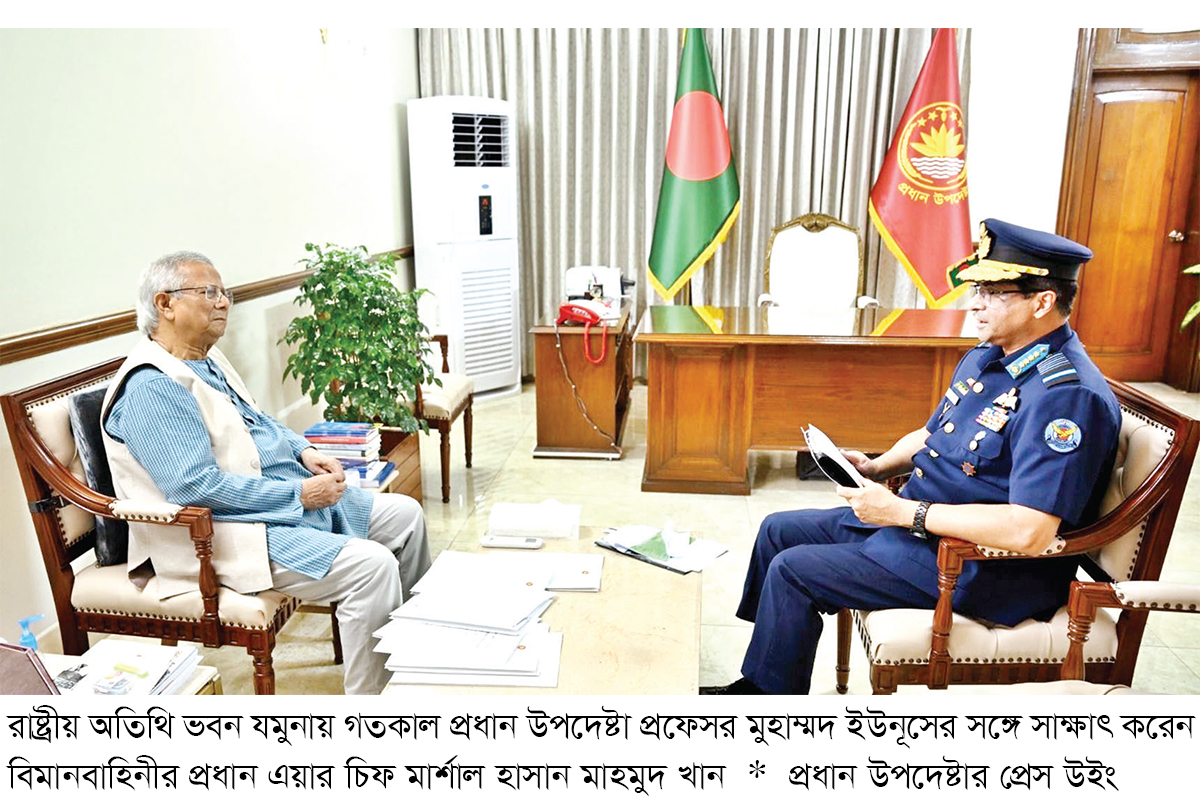 রাষ্ট্রীয় অতিথি ভবন যমুনায় অন্তর্বর্তী সরকারের প্রধান উপদেষ্টা প্রফেসর মুহাম্মদ ইউনূসের সঙ্গে সাক্ষাৎ করেছেন বাংলাদেশ বিমানবাহিনীর প্রধান এয়ার চিফ মার্শাল হাসান মাহমুদ খান। গতকাল বুধবার বিকেলে সৌজন্য এই সাক্ষাতে তারা সাম্প্রতিক পেশাগত বিষয়াদি ও জাতীয় নিরাপত্তা সংক্রান্ত বিভিন্ন দিক নিয়ে আলোচনা করেন বলে জানা গেছে।