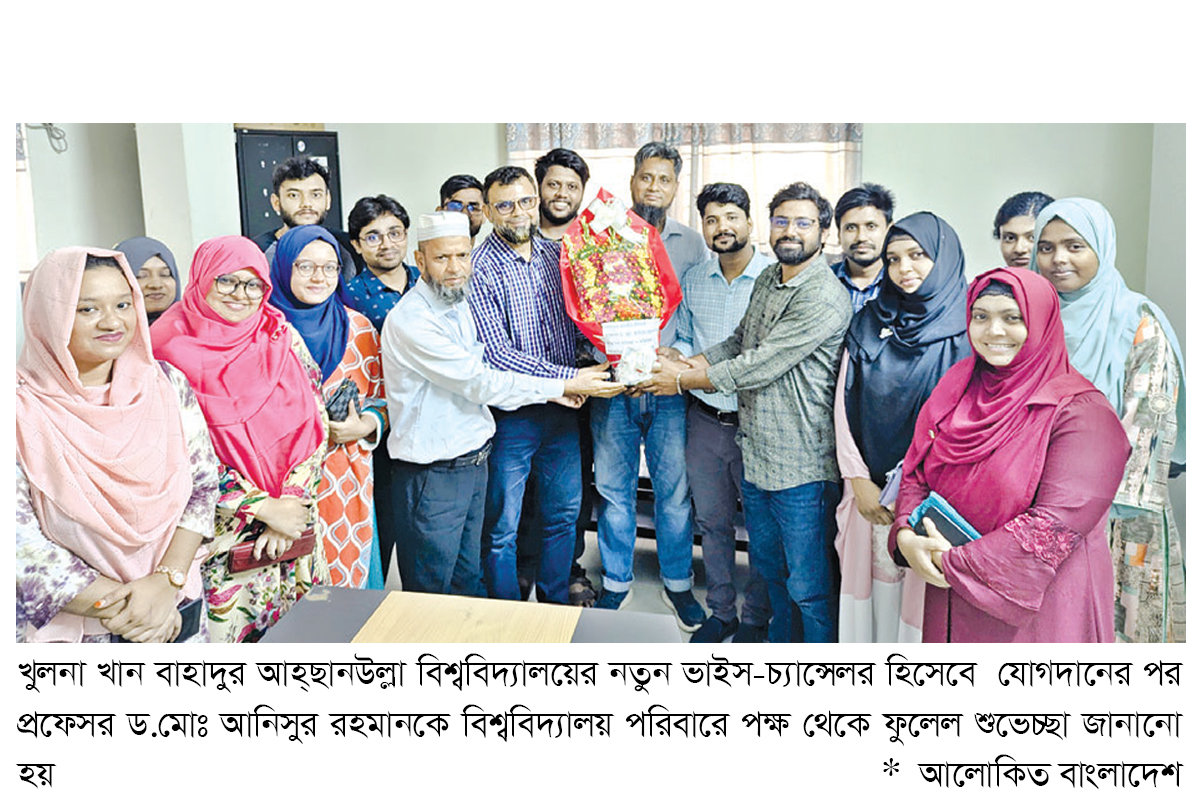 খুলনা খান বাহাদুর আহ্ছানউল্লা বিশ্ববিদ্যালয় (কেকেবিএইউ)-এর নতুন ভাইস-চ্যান্সেলর (ডেজিগনেট অ্যান্ড অনারারী) দায়িত্বভার গ্রহণ করেছেন খুলনা বিশ্ববিদ্যালয়ের কম্পিউটার সায়েন্স এ্যান্ড ইঞ্জিনিয়ারিং ডিসিপ্লিনের প্রফেসর ড. মো. আনিসুর রহমান। গতকাল দায়িত্বভার গ্রহণের পরপরই বিশ্ববিদ্যালয় পরিবারের পক্ষ থেকে তাকে ফুলেল শুভেচ্ছা জানানো হয়। এ সময়ে বিশ্ববিদ্যালয়ের রেজিস্ট্রার এসএম আতিয়ার রহমান, ইঞ্জিনিয়ারিং অনুষদের ডিন ড. মো. মুঈন উদ্দিন, সিএসই বিভাগের প্রধান রথীন্দ্রনাথ মহালদার, ইংরেজি বিভাগের প্রধান তাসনুভা খায়ের, তথ্য বিজ্ঞান ও গ্রন্থাগার ব্যবস্থাপনা বিভাগের প্রধান ফারজানা শারমিন আনিকা ও প্রক্টর মুশফিক শাহরিয়ার শাফিসহ বিভিন্ন বিভাগের শিক্ষক, কর্মকর্তা-কর্মচারীরা উপস্থিত ছিলেন। ভাইস-চ্যান্সেলর নবপ্রতিষ্ঠিত এ বিশ্ববিদ্যালয়ের অগ্রযাত্রায় সংশ্লিষ্ট সবার আন্তরিক সহযোগিতা কামনা করেন। তিনি আরও বলেন সবার সম্মিলিত প্রচেষ্টায় এ বিশ্ববিদ্যালয়কে উৎকর্ষের লক্ষ্যে এগিয়ে নিয়ে যেতে হবে। আগামী মাসে নতুন ক্যাম্পাসে বিশ্ববিদ্যালয় স্থানান্তরিত হলে শিক্ষার অনুকূল পরিবেশ সৃষ্টি হবে যা এ বিশ্ববিদ্যালয়ের জন্য হবে অগ্রগতির মাইলফলক। তিনি এ বিশ্ববিদ্যালয়ের বোর্ড অব ট্রাস্টিজের চেয়ারম্যান, ঢাকা আহ্ছানিয়া মিশনের সভাপতি ও খুলনা বিশ্ববিদ্যালয়ের সাবেক প্রথম ভাইস-চ্যান্সেলর প্রফেসর ড. গোলাম রহমানসহ ট্রাস্টি বোর্ডের অন্যান্য সদস্যদের প্রতি আন্তরিক কৃতজ্ঞতা প্রকাশ করেন। সূত্র : সংবাদ বিজ্ঞপ্তি