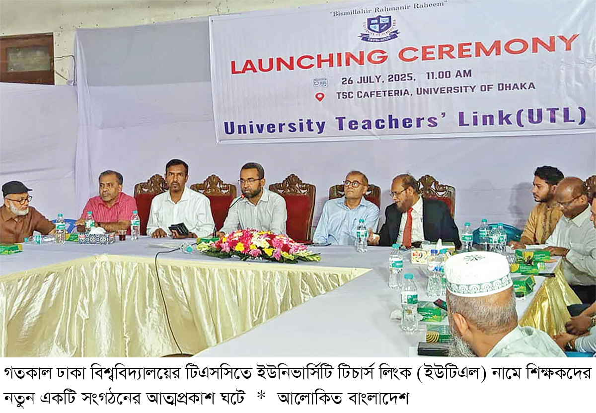 দেশের সরকারি ও বেসরকারি বিশ্ববিদ্যালয়ের শিক্ষকদের মর্যাদা রক্ষা ও ২০২৪ সালের জুলাই গণঅভ্যুত্থানের স্পিরিটকে ধারণ করে ইউনিভার্সিটি টিচার্স লিংক (ইউটিএল) নামে শিক্ষকদের নতুন একটি সংগঠনের আত্মপ্রকাশ হয়েছে। গতকাল শনিবার বেলা ১১টায় ঢাকা বিশ্ববিদ্যালয়ের (ঢাবি) টিএসসি ক্যাফেটেরিয়ায় এ উপলক্ষে এক অনুষ্ঠানের আয়োজন করা হয়।