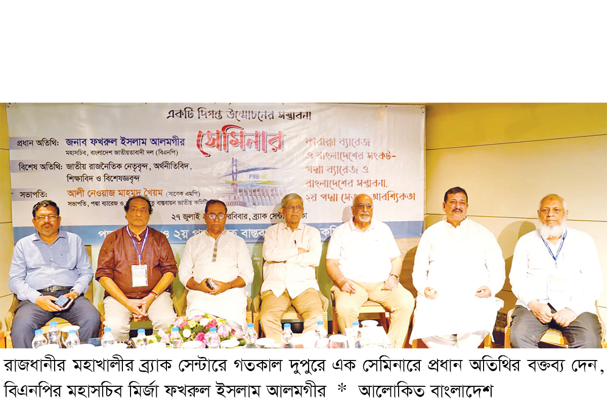 বিএনপির মহাসচিব মির্জা ফখরুল ইসলাম আলমগীর বলেছেন, পদ্মা ব্যারেজ ও দ্বিতীয় পদ্মা সেতু বাস্তবায়নের জন্য সবচেয়ে বেশি প্রয়োজন রাজনৈতিক অঙ্গীকার। জনগণের মধ্য থেকে এই দাবি উঠে এলেই তা সম্ভব হবে। গতকাল রোববার দুপুরে রাজধানীর মহাখালীর ব্র্যাক সেন্টারে ‘পদ্মা ব্যারেজ ও দ্বিতীয় পদ্মা সেতু বাস্তবায়ন প্রয়োজনীয়তা’ শীর্ষক এক সেমিনারে প্রধান অতিথির বক্তব্যে তিনি এ কথা বলেন। মির্জা ফখরুল বলেন, প্রায় আট কোটি মানুষের জীবন-জীবিকা পদ্মা ব্যারেজ ও পদ্মা সেতুর সঙ্গে জড়িত। দীর্ঘ সাতবার সম্ভাব্যতা যাচাই হলেও এখন পর্যন্ত কোনো চূড়ান্ত সিদ্ধান্তে পৌঁছানো যায়নি, যা অত্যন্ত দুর্ভাগ্যজনক।