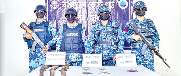 কক্সবাজারের মহেশখালীতে যৌথ অভিযান চালিয়ে তিনটি দেশীয় তৈরি আগ্নেয়াস্ত্র, ২০ রাউন্ড তাজা গুলি ও পাঁচ রাউন্ড কার্তুজ উদ্ধার করেছে বাংলাদেশ কোস্ট গার্ড ও নৌবাহিনী। গত বুধবার ভোরে হোয়ানক ইউনিয়নের কেরুনতলী এলাকায় এ অভিযান চালানো হয়। কোস্ট গার্ডের মহেশখালী স্টেশন ও নৌবাহিনীর সদস্যরা যৌথভাবে এই অভিযান পরিচালনা করেন। কোস্ট গার্ড জানায়, গোপন সংবাদের ভিত্তিতে অভিযান চলাকালে সন্ত্রাসীরা যৌথ বাহিনীর উপস্থিতি টের পেয়ে পালিয়ে যায়। ফলে কাউকে আটক করা সম্ভব হয়নি। অভিযানে উদ্ধার করা আগ্নেয়াস্ত্র ও গোলাবারুদ আইনি প্রক্রিয়ার মাধ্যমে হস্তান্তরের ব্যবস্থা চলমান রয়েছে বলে জানিয়েছে কোস্ট গার্ড। সংস্থাটির মিডিয়া কর্মকর্তা লেফটেন্যান্ট কমান্ডার সিয়াম উল হক বলেন, দেশের আইনশৃঙ্খলা রক্ষায় কোস্ট গার্ডের এ ধরনের অভিযান ভবিষ্যতেও অব্যাহত থাকবে। সূত্র: সংবাদ বিজ্ঞপ্তি