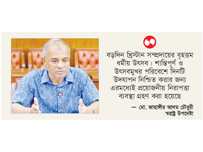 খ্রিস্টান সম্প্রদায়ের প্রধান ধর্মীয় উৎসব বড়দিন উদযাপনকে সামনে রেখে সারা দেশে, বিশেষ করে রাজধানীতে নিরাপত্তাব্যবস্থা জোরদার করা হয়েছে। স্বরাষ্ট্র উপদেষ্টা লেফটেন্যান্ট জেনারেল (অব.) মো. জাহাঙ্গীর আলম চৌধুরী বলেছেন, সরকার খ্রিস্টানদের যথাযথ ধর্মীয় উৎসাহ ও উদ্দীপনার সঙ্গে এবং উৎসবমুখর পরিবেশে বড়দিন উদযাপনের সুযোগ করে দেওয়ার জন্য প্রয়োজনীয় সব ধরনের ব্যবস্থা গ্রহণ করেছে।
