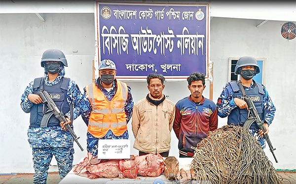 তিনি বলেন, গোপন সংবাদের ভিত্তিতে শনিবার মধ্যরাত ২টায় কোস্ট গার্ড আউটপোস্ট নলিয়ান কর্তৃক খুলনার দাকোপ থানাধীন সুন্দরবনের নলিয়ান সংলগ্ন মুচির দোয়ানি খালে একটি বিশেষ অভিযান পরিচালনা করা হয়। অভিযান চলাকালীন উক্ত এলাকা থেকে সাড়ে ২১ কেজি হরিণের মাংস, একটি মাথা, চারটি পা ও ৬০০ মিটার হরিণ শিকারের ফাঁদসহ দুইজন হরিণ শিকারিকে আটক করা হয়। সূত্র : সংবাদ বিজ্ঞপ্তি