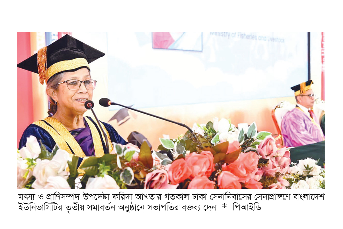 মৎস্য ও প্রাণিসম্পদ উপদেষ্টা ফরিদা আখতার বলেছেন, ডিগ্রি অর্জনই তরুণদের শেষ দায়িত্ব নয়। সমাজের একটি বড় অংশ এখনও উচ্চশিক্ষার সুযোগ থেকে বঞ্চিত থাকায় শিক্ষিত তরুণদের ওপর সমাজ পরিবর্তনের দায়িত্ব আরও বেশি। গতকাল রোববার সকালে ঢাকার সেনানিবাসস্থ সেনাপ্রাঙ্গণে বাংলাদেশ ইউনিভার্সিটির ৩য় সমাবর্তন অনুষ্ঠানে সভাপতির বক্তব্যে তিনি এসব কথা বলেন। গণপ্রজাতন্ত্রী বাংলাদেশের রাষ্ট্রপতি ও বাংলাদেশ ইউনিভার্সিটির চ্যান্সেলর কর্তৃক মনোনীত সমাবর্তন সভাপতি হিসেবে তিনি উপস্থিত ছিলেন। মৎস্য ও প্রাণিসম্পদ উপদেষ্টা বলেন, ২০২৪ সালে বাংলাদেশের তরুণ প্রজন্ম অন্যায় ও অবিচারের বিরুদ্ধে দাঁড়িয়ে দেশকে নতুনভাবে বিশ্বের সামনে তুলে ধরেছে। তবে শুধু ব্যক্তি পরিবর্তন যথেষ্ট নয়; প্রকৃত পরিবর্তনের জন্য প্রাতিষ্ঠানিক সংস্কার অপরিহার্য।