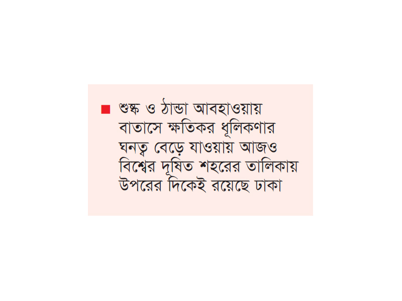 ছুটির দিনের সকালে রাজধানীর সড়কে যানবাহনের চাপ কম থাকলেও বায়ুদূষণ থেকে মুক্তি মিলছে না নগরবাসীর। শুষ্ক ও ঠান্ডা আবহাওয়ায় বাতাসে ক্ষতিকর ধূলিকণার ঘনত্ব বেড়ে যাওয়ায় আজও বিশ্বের দূষিত শহরের তালিকায় উপরের দিকেই রয়েছে ঢাকা।