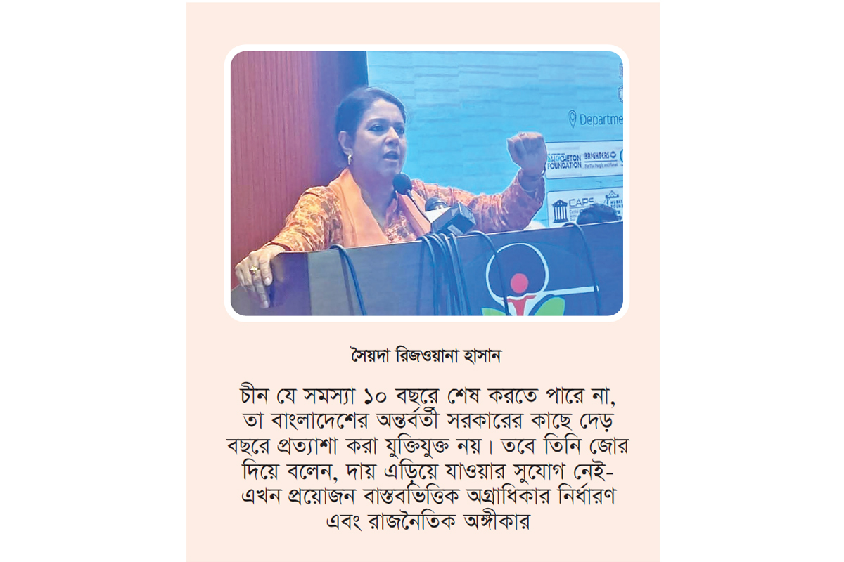 রিজওয়ানা হাসান বলেন, চীন যে সমস্যা ১০ বছরে শেষ করতে পারে না, তা বাংলাদেশের অন্তর্বর্তী সরকারের কাছে দেড় বছরে প্রত্যাশা করা যুক্তিযুক্ত নয়। তবে তিনি জোর দিয়ে বলেন, দায় এড়িয়ে যাওয়ার সুযোগ নেই- এখন প্রয়োজন বাস্তবভিত্তিক অগ্রাধিকার নির্ধারণ এবং রাজনৈতিক অঙ্গীকার।