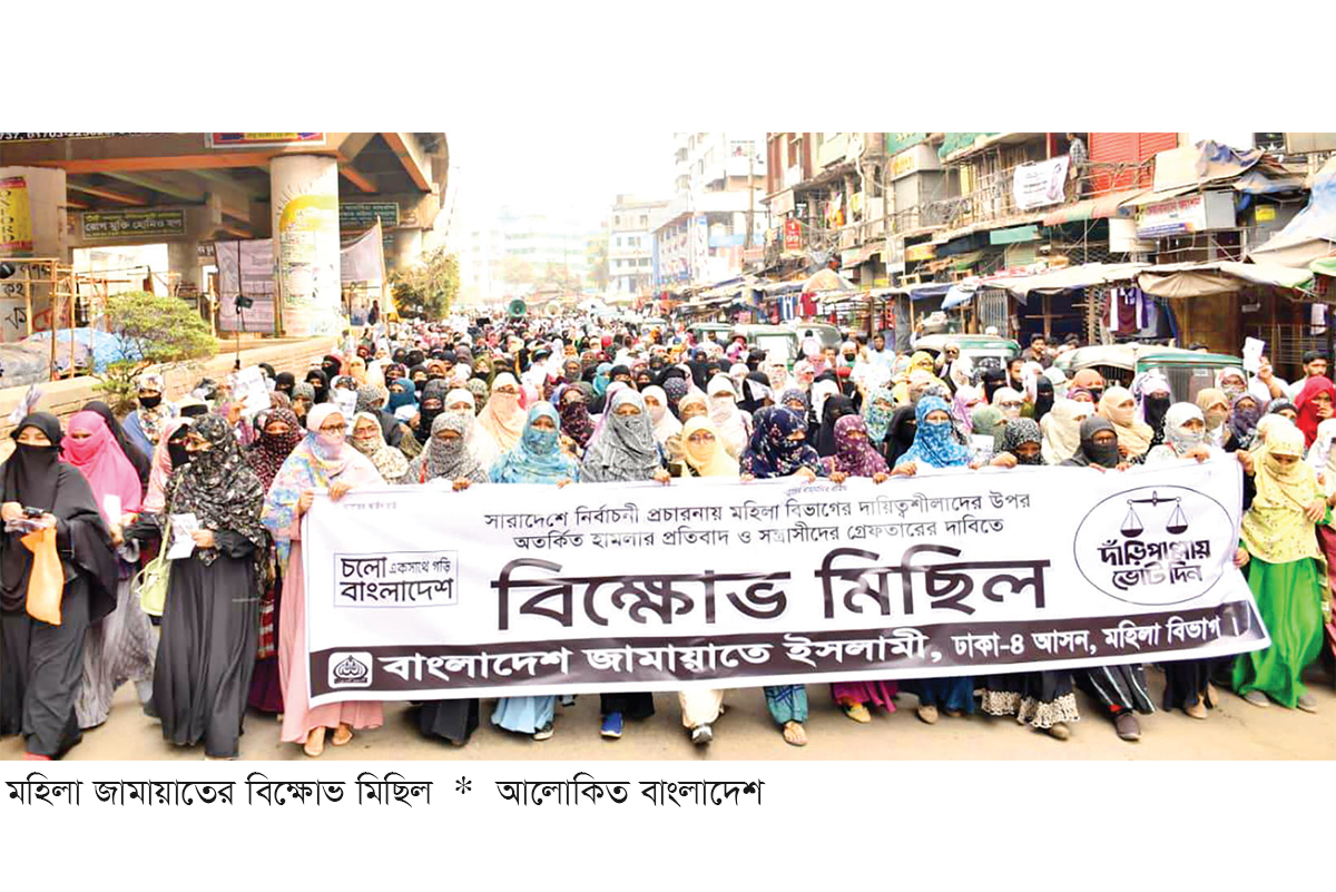 নির্বাচনি প্রচারণায় সারাদেশে নারীদের ওপর হামলার প্রতিবাদে ও জড়িতদের গ্রেপ্তারের দাবিতে রাজধানীতে বিক্ষোভ করেছে বাংলাদেশ জামায়াতে ইসলামীর মহিলা শাখা। বিক্ষোভ পরবর্তী সমাবেশে জামায়াতে ইসলামীর কেন্দ্রীয় কর্মপরিষদ সদস্য ও ঢাকা মহানগর দক্ষিণের মহিলা বিভাগের সেক্রেটারি আয়েশা সিদ্দিকা পারভীন বলেন, ‘তারাই গুপ্ত যারা ১৯ বছর বিদেশে পালিয়ে ছিল।’ তিনি আরও বলেন, জামায়াতে ইসলামীর কোনো নেতাকর্মী বিদেশে পালিয়ে ছিল না। বরং জেল-জুলুম, নির্যাতন সহ্য করে জনগণের অধিকার প্রতিষ্ঠার আন্দোলন চালিয়েছে। এই আন্দোলনে জামায়াতে ইসলামীর শীর্ষ ১১ জন নেতাসহ অসংখ্য নেতাকর্মী শাহাদাত বরণ করেছেন। হাজার হাজার নেতাকর্মীর জীবন ও রক্তের বিনিময়ে ফ্যাসিবাদের পতনের পর যারা দেশে এসেছে তারাই আসল গুপ্ত।