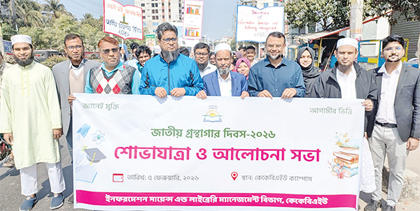 জাতীয় গ্রন্থাগার দিবস উপলক্ষে গতকাল বৃহস্পতিবার খুলনা খান বাহাদুর আহ্ছানউল্লা বিশ্ববিদ্যালয়ের ইনফরমেশন সায়েন্স এন্ড লাইব্রেরি ম্যানেজমেন্ট (আইএসএলএম) বিভাগের উদ্যোগে বিভিন্ন কর্মসূচি পালিত হয়। এ উপলক্ষে সকাল ১১টায় বিশ্ববিদ্যালয়ের উপাচার্য (ডেজিগনেট) প্রফেসর ড. মোঃ আনিসুর রহমানের নেতৃত্বে এক বর্ণাঢ্য শোভাযাত্রা বের করা হয়। শোভাযাত্রাটি বিশ্ববিদ্যালয়ের ক্যাম্পাসের সামনের এম এ বারী সড়ক প্রদক্ষিণ করে পুনরায় ক্যাম্পাস ভবনের সামনে এসে শেষ হয়। অতঃপর এ উপলক্ষে আয়োজিত আলোচনা সভায় প্রধান অতিথির বক্তব্যে উপাচার্য বলেন জ্ঞানভিত্তিক সমাজ গঠনের মূলভিত্তি হচ্ছে গ্রন্থাগার।