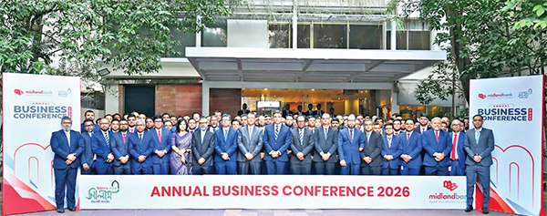 মিডল্যান্ড ব্যাংক পিএলসির শাখা, উপ-শাখা, ইসলামী ব্যাংকিং, এজেন্ট ব্যাংকিং, রিটেইল সেলস, ইনস্টিটিউশনাল ব্যাংকিং, এসএমই, এনআরবি, কার্ডস এবং ট্রেজারি বিভাগের বার্ষিক ব্যবসা সম্মেলন গত শুক্রবার অনুষ্ঠিত হয়। বার্ষিক ব্যবসা সম্মেলন ২০২৬ উপলক্ষে আয়োজিত অনুষ্ঠানে বিশেষ অতিথি হিসাবে উপস্থিত ছিলেন ব্যাংকের পরিচালনা পর্ষদের সম্মানিত স্বতন্ত্র পরিচালক রিয়াজ আহমেদ চৌধুরী।